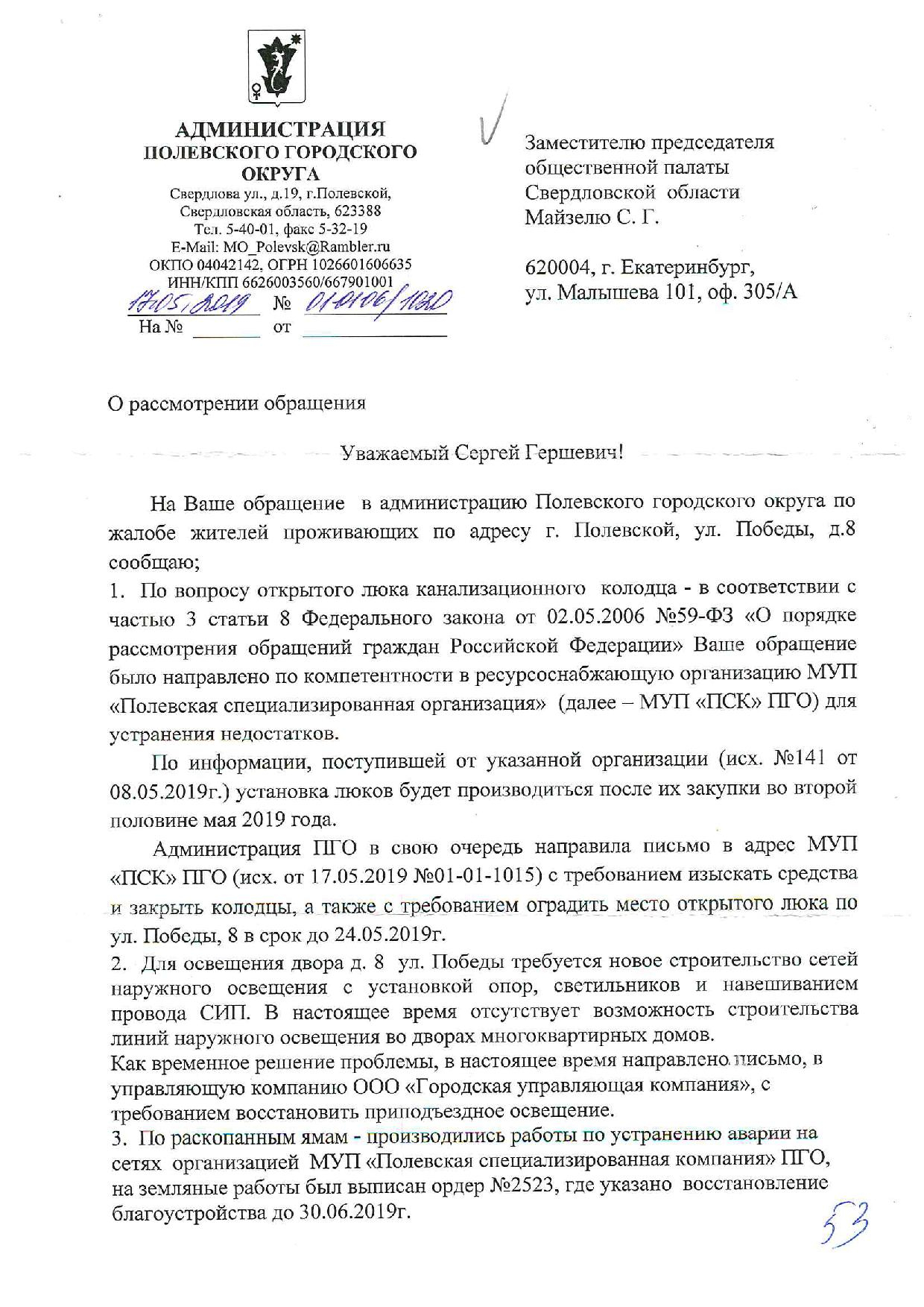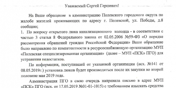 Номер жалобы:53204 Тип жалобы:Иные проблемы ЖКХ Название объекта: Регион:Свердловская область Город:Полевской Адрес:улица Победы, 8 Описание жалобы:Добрый день. Хотела бы написать жалобу на состояние нашего двора. Живу с маленьким ребенком и выйти во двор подышать свежим воздухом просто не безопасно. Такое ощущение что детей выгуливать не обходимо на шлейки чтоб нечего не случилось. Состояние дорог во дворе я описывала в жалобе 53202 но теперь не про это. Между домами открытый канализационный люк перекрыт деревяшкой, которую подростки очень часто открывают. В тёмное время суток на 3х домах которые огораживают двор нет освещения- освещение во дворе полностью отсутствует. Раскопанные ямы комунальщиков не приброны. Во дворе так же находятся не понятные рухлые постройки и гаражи_ при этом некоторые в очень аварийных состояниях, которые уже горели. Почему власти бездействуют не убирают это или не принуждает хозяев этих построек или ждут когда подростки (а их в наших дворах очень много) травмипуются там. На сколько мне известно в нашем дворе предусмотрена детская площадка, но где она? Детям не где играть. Двор выглядит так как будто он после бомбёжки. Надеюсь наш двор приведут в пригодный для проживания и не будет опасно выходить с детьми. Очень бы хотелось чтоб установили железный люк на канализационный колодец, выравнили дороги, прикрыли раскопки комунальщиков, убрали ветхие постройки и самое главное оборудовали детские площадки. Статус: