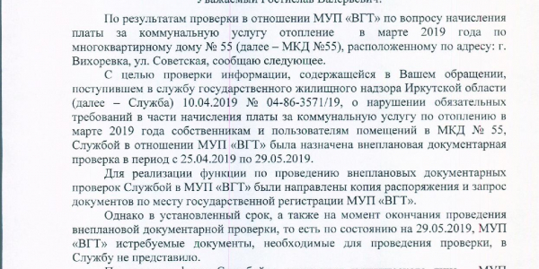 Номер жалобы:53021 Тип жалобы:Иные проблемы ЖКХ Название объекта:МУП ВГТ Регион:Иркутская область Город:Вихоревка Адрес:Советская 55-21 Описание жалобы:Поступил перерасчет ком услуг на 2224 руб (за тепло ) которого небыло по факту (мерзли даже по телевизору показывали) и постоянно отключали и так не горяячии ботареи Статус: