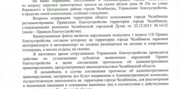 Номер жалобы:53049 Тип жалобы:Иные проблемы ЖКХ Название объекта: Регион:Челябинская область Город:Челябинск Адрес:улица Воровского, 23В Описание жалобы:Парковка на газоне рядом с Воровского 23В с противоположной от подъездов стороны. Статус: