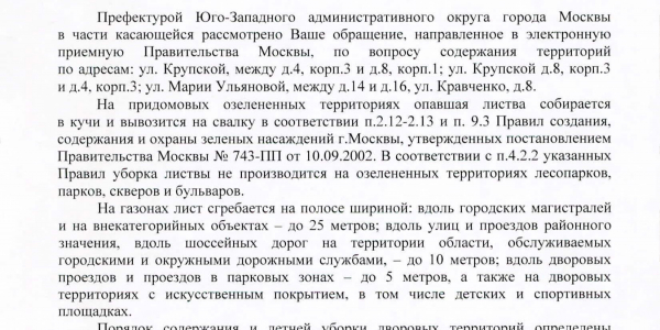Номер жалобы:53236 Тип жалобы:Иные проблемы ЖКХ Название объекта: Регион:Москва Город:Москва Адрес:улица Крупской, 8к1 Описание жалобы:Во дворе между домами 8к1 и 4к3 по ул. Крупской убрали опавшую листву, однако до ближайшей городской магистрали явно больше 25 метров, до ближайшей районной улицы — более 10 метров, а двор непроезжий. Напомню, что уборка листвы приводит к обеднению и выветриванию почв, а также запрещена в неположенных местах. Просьба провести проверку по выявленному факту и в случае обнаружения нарушений принять меры в рамках компетенции.
