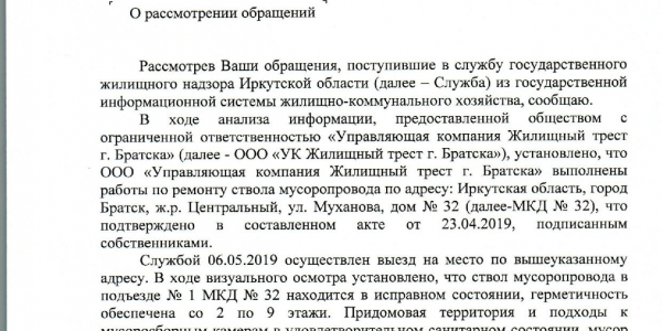 Номер жалобы:53265 Тип жалобы:Иные проблемы ЖКХ Название объекта: Регион:Иркутская область Город:Братск Адрес:улица Муханова, 32 Описание жалобы:Разрушен мусоропровод Статус: