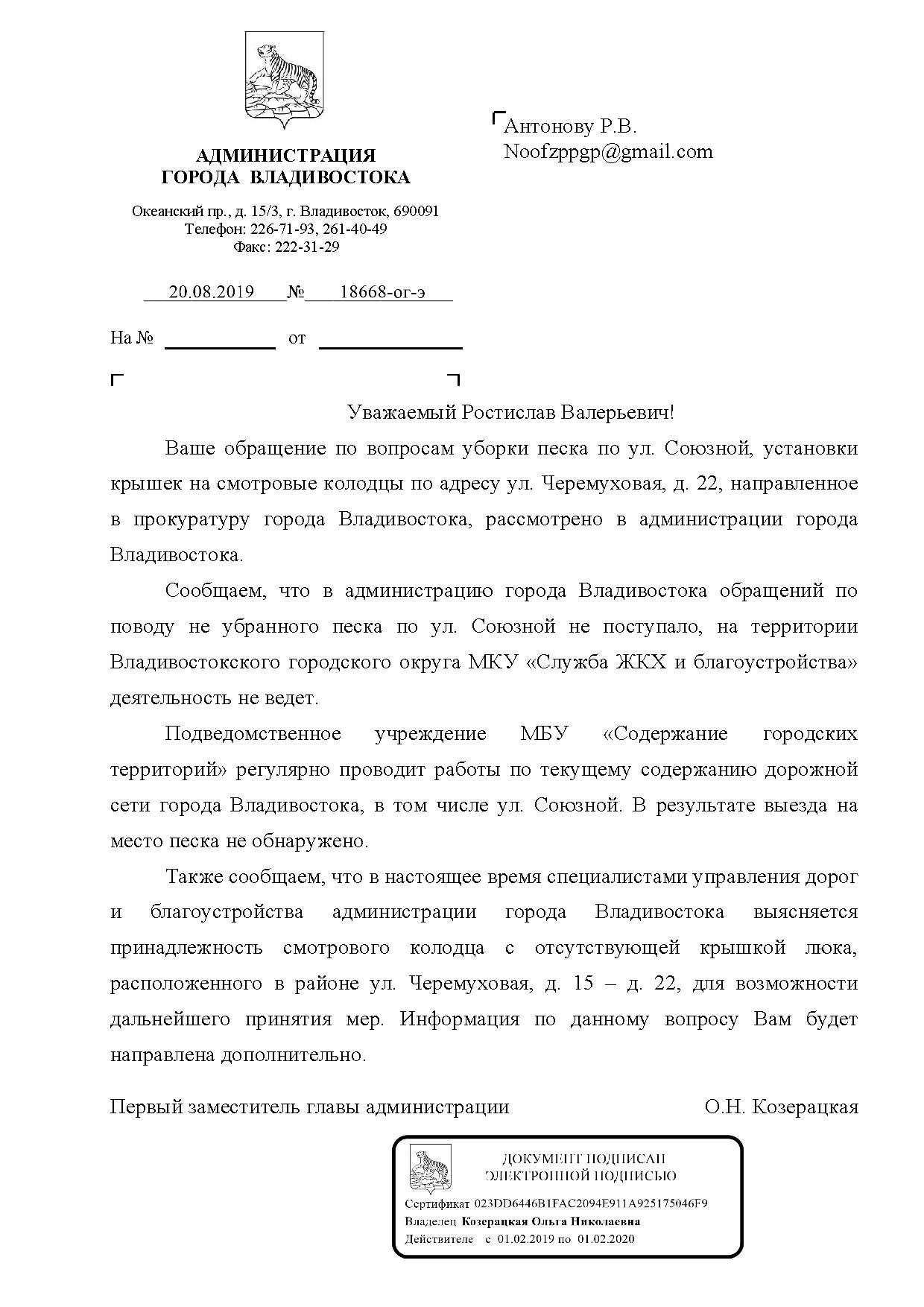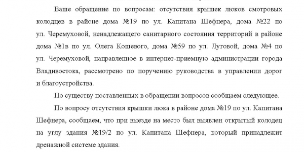 Номер жалобы:52841 Тип жалобы:Иные проблемы ЖКХ Название объекта: Регион:Приморский край Город:Владивосток Адрес:Черёмуховая улица, 22 Описание жалобы:Открытые колодцы, напротив ТЦ Черёмушки, по прежнему ждут своих жертв. Статус: