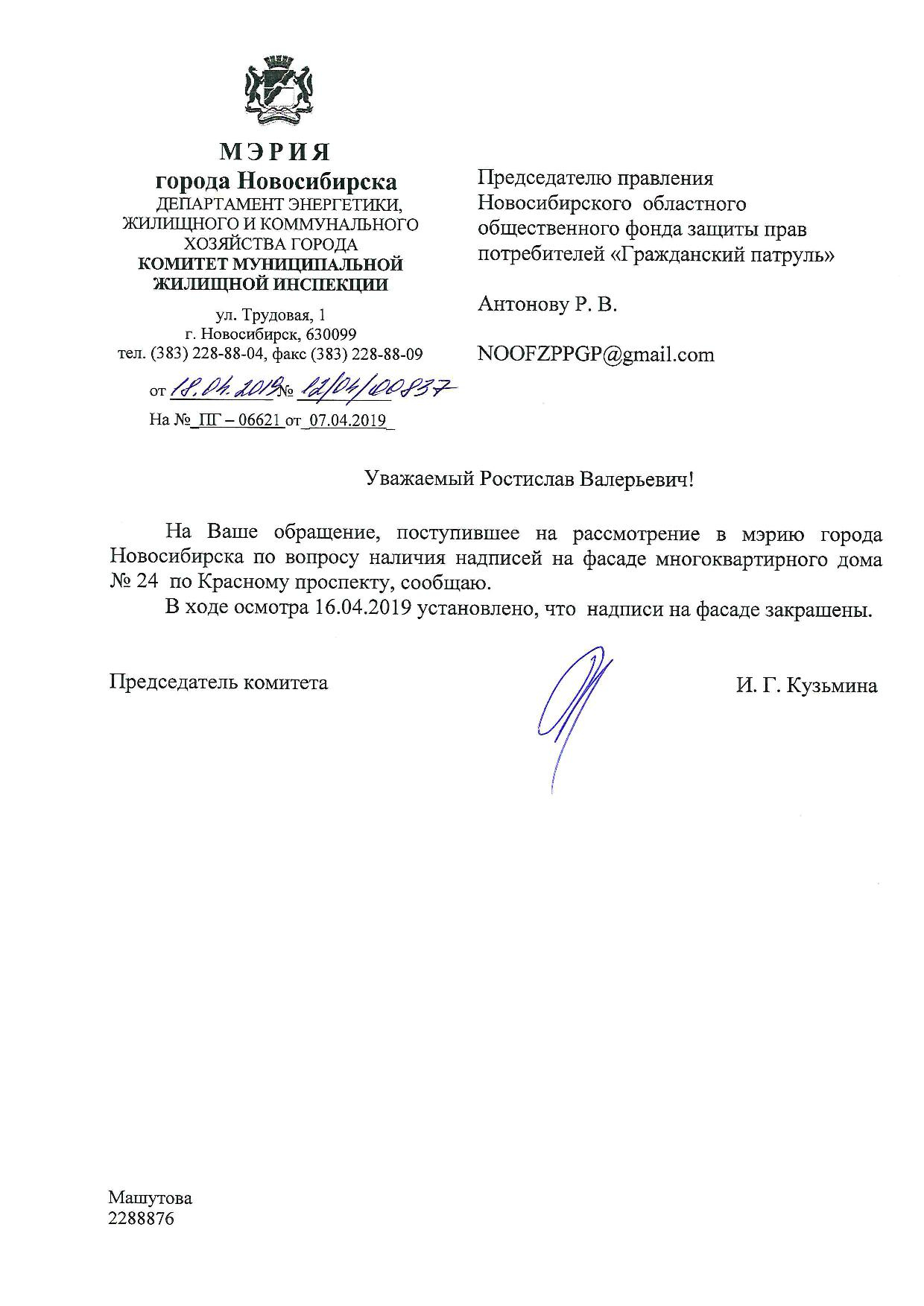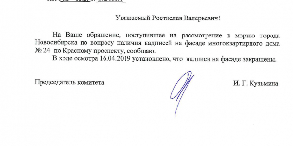 Номер жалобы:52918 Тип жалобы:Иные проблемы ЖКХ Название объекта: Регион:Новосибирская область Город:Новосибирск Адрес:Красный проспект, 24 Описание жалобы:Надписи на фасаде Статус: