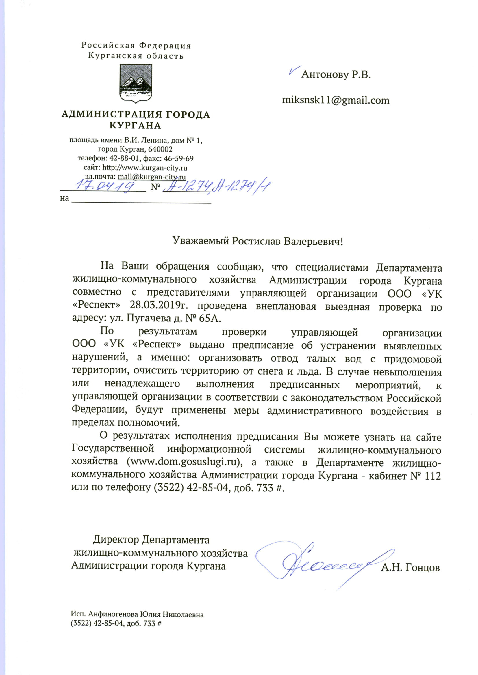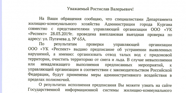 Номер жалобы:52648 Тип жалобы:Иные проблемы ЖКХ Название объекта: Регион:Курганская область Город:Курган Адрес:улица Пугачёва, 65А Описание жалобы:Во дворе дома стоит вода,жильцам не пройти к подъезду.Снег за всю зиму не убирали.УК Респект Статус: