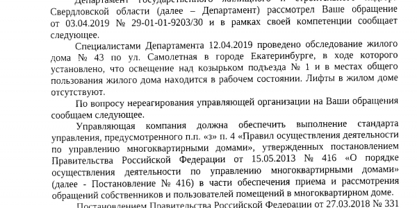 Номер жалобы:52525 Тип жалобы:Иные проблемы ЖКХ Название объекта: Регион:Свердловская область Город:Екатеринбург Адрес:Самолётная улица, 43 Описание жалобы:Нет фонаря над козырьком, просьба установить. 1 подъезд, Самолетная 43 Статус:
