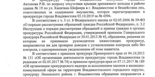 Номер жалобы:52720 Тип жалобы:Иные проблемы ЖКХ Название объекта: Регион:Приморский край Город:Владивосток Адрес:улица Капитана Шефнера, 19 Описание жалобы:Отсутствует крышка люка Статус: