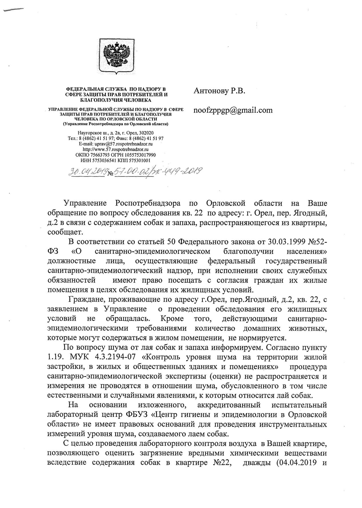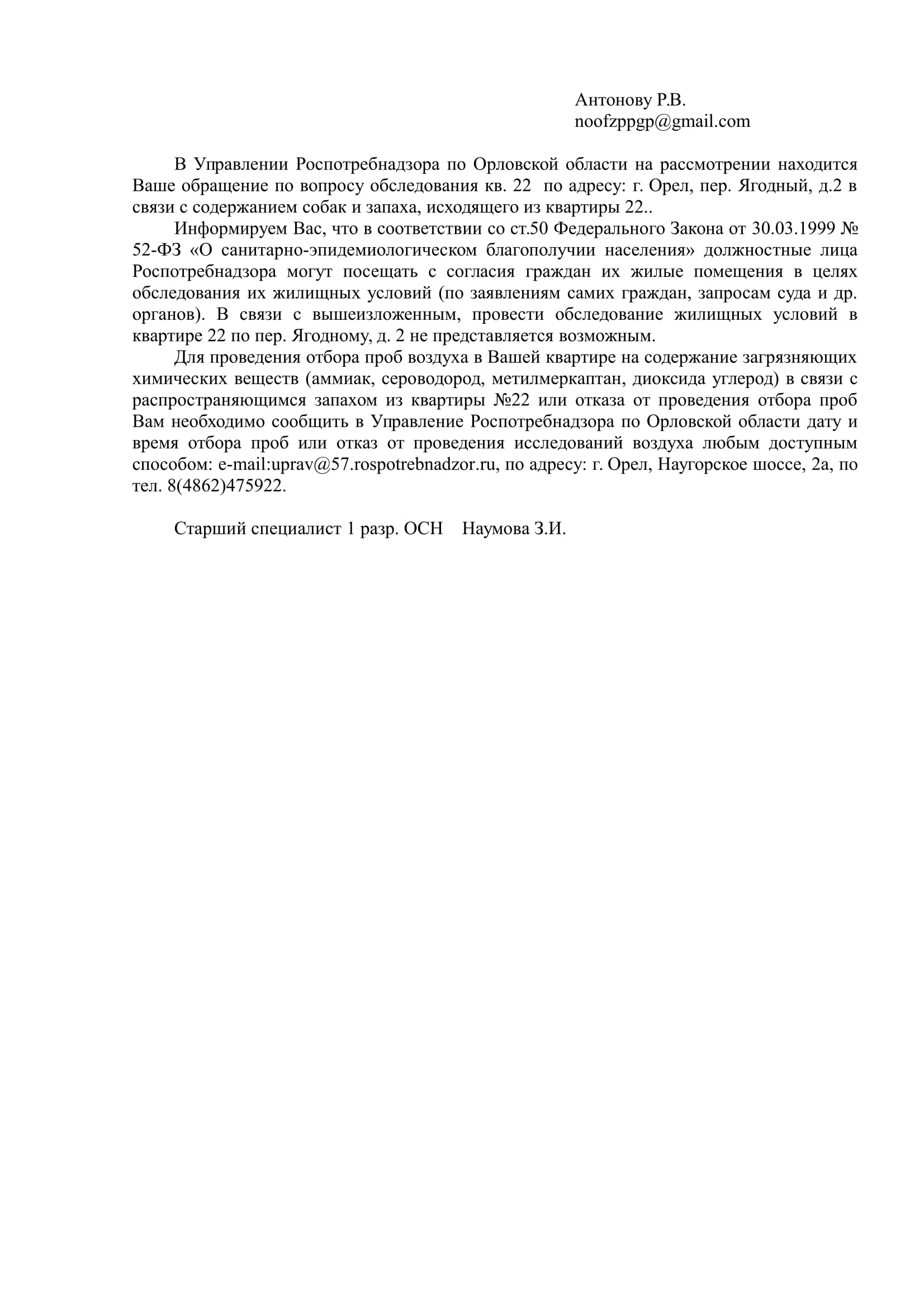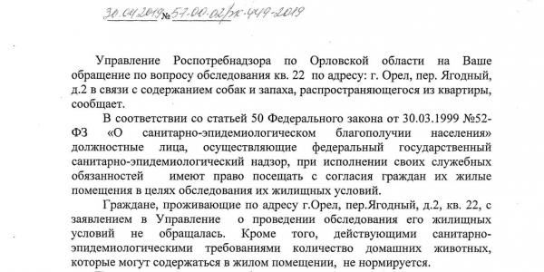 Номер жалобы:52234 Тип жалобы:Иные проблемы ЖКХ Название объекта:Жилищная инспекция Орловской области, Роспотребнадзор Орловской области, Прокуратура Орловской области Регион:Орловская область Город:Орёл Адрес:Ягодный переулок, 2 Описание жалобы:Жалоба в сообщениях группы от подписчицы