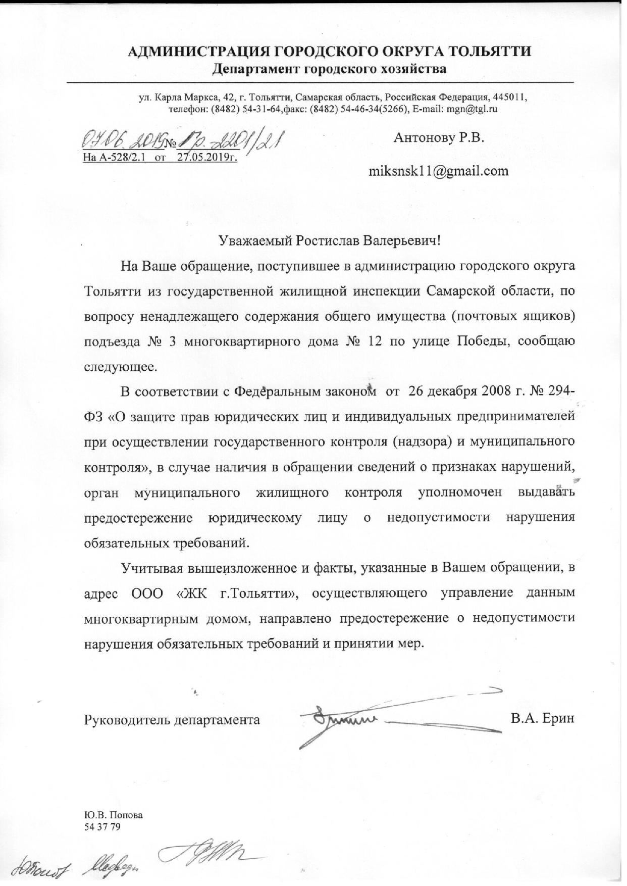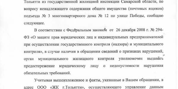 Номер жалобы:52388 Тип жалобы:Иные проблемы ЖКХ Название объекта:УК "Жилищная компания" Регион:Самарская область Город:Тольятти Адрес:ул. Победы, д. 12, подъезд 3 Описание жалобы:После капитального ремонта почтовые ящики не приведены в должный вид. Сил просто нет терпеть все это. Сколько можно еще издеваться над людьми? Статус: