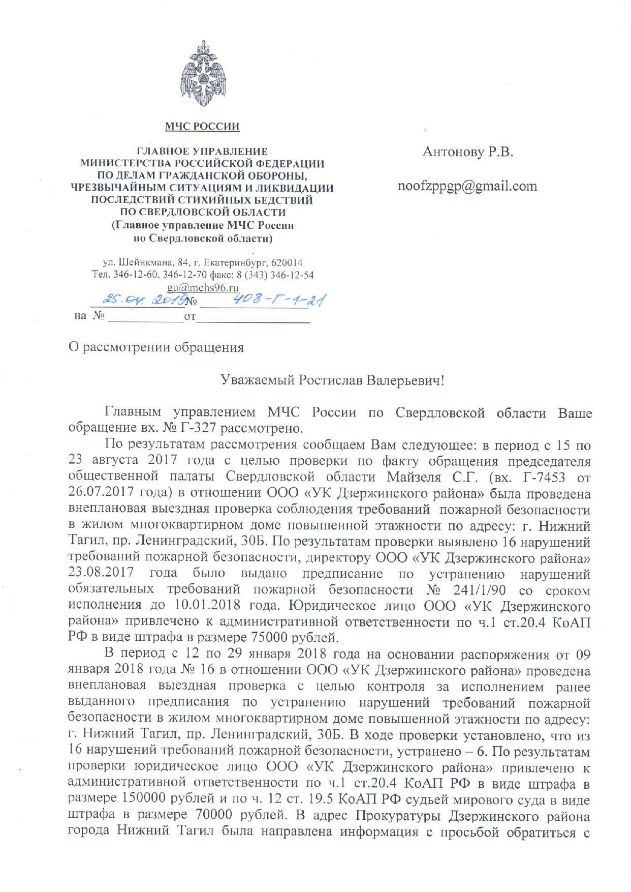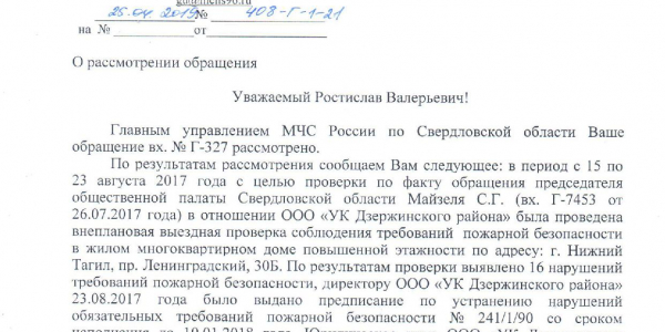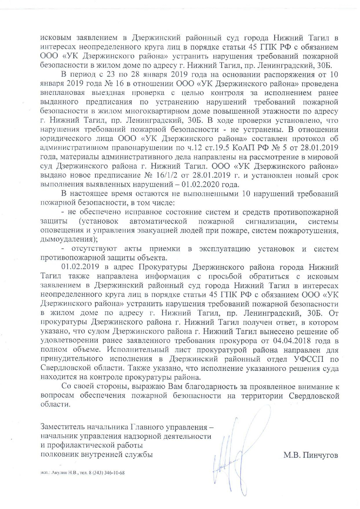 Номер жалобы:52433 Тип жалобы:Иные проблемы ЖКХ Название объекта: Регион:Свердловская область Город:Нижний Тагил Адрес:Ленинградский проспект, 30Б Описание жалобы:Требуем произвести проверку работоспособности системы пожаротушения. 4 года как дом сдан, а система не активна. Так же как и система дымоудаления. Управляющая компания всячески препятствует вводу в эксплуатацию вышеупомянутых систем. Мы хотим жить в безопасности. Статус: