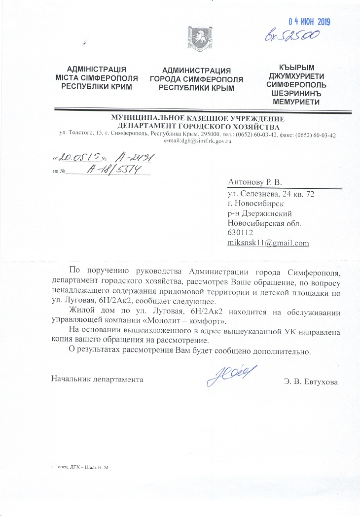 Номер жалобы:52389 Тип жалобы:Иные проблемы ЖКХ Название объекта: Регион:Республика Крым Город:Симферополь Адрес:Симферополь, Луговая улица, 6Н/2Ак1 Описание жалобы:К жалобе 49122