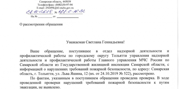 Номер жалобы:52303 Тип жалобы:Иные проблемы ЖКХ Название объекта: Регион:Самарская область Город:Тольятти Адрес:ул. Льва Яшина, 12 Описание жалобы:Постоянно закрывают дверь на замок. При пожаре грозит гибель жителей дома. Неоднократно, при не работающих лифтах, выбраться из дома невозможно. Вахтеры говорят, если что откроем. Можно ли доверить свои жизни бабушкам на вахте? Статус: