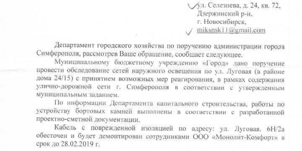 В ответ на письмо администрации Симферопыля от 20.02.19 исх. номер А-660, сообщаю, что высоковольтный кабель под напряжением на газоне во дворе жилого дома, с поврежденной изоляцией, вблизи детской площадки,так и не убран на 25.03.2019, прошу убрать. Статус: