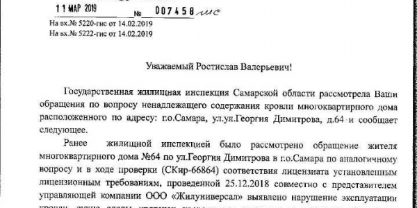 Номер жалобы:52508 Тип жалобы:Иные проблемы ЖКХ Название объекта: Регион:Самарская область Город:Самара Адрес:Самара, улица Георгия Димитрова, 64 Описание жалобы:Течь крыши. дополнительная информация в вк самара Юлия Гаврилова (написано латиницей) Статус: