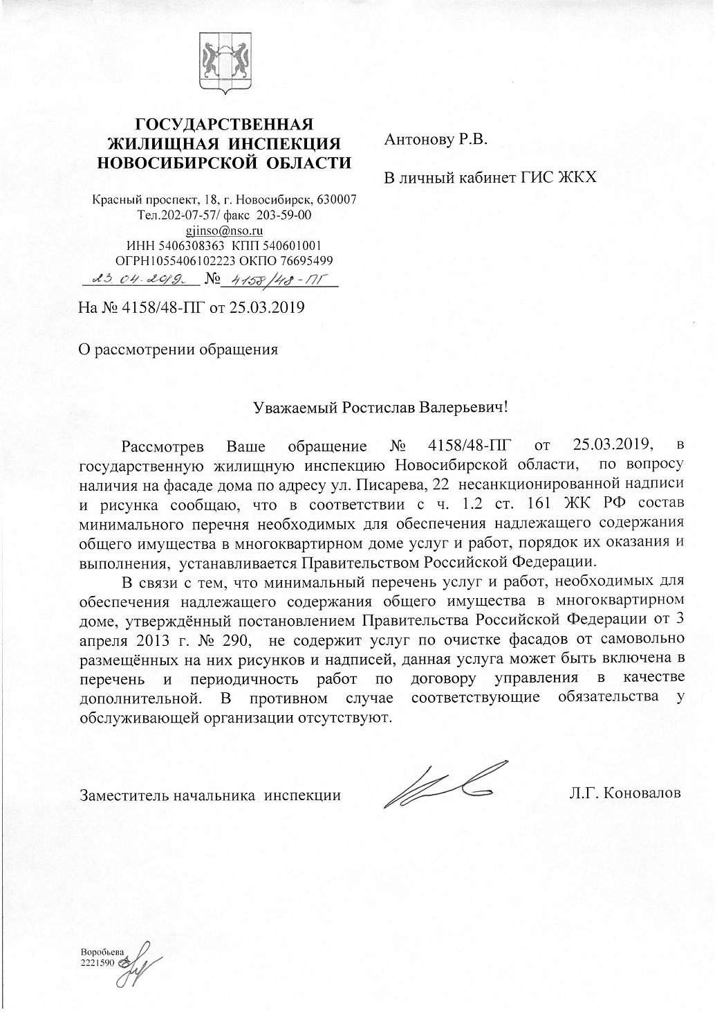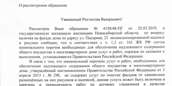 Номер жалобы:51507 Тип жалобы:Иные проблемы ЖКХ Название объекта: Регион:Новосибирская область Город:Новосибирск Адрес:улица Писарева, 22 Описание жалобы:Надписи на фасаде дома Статус: