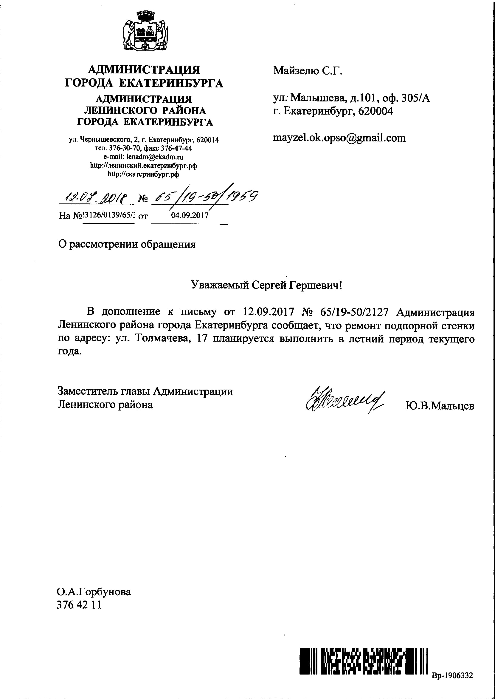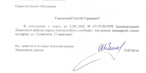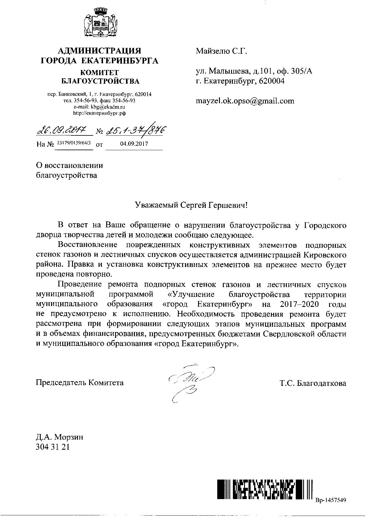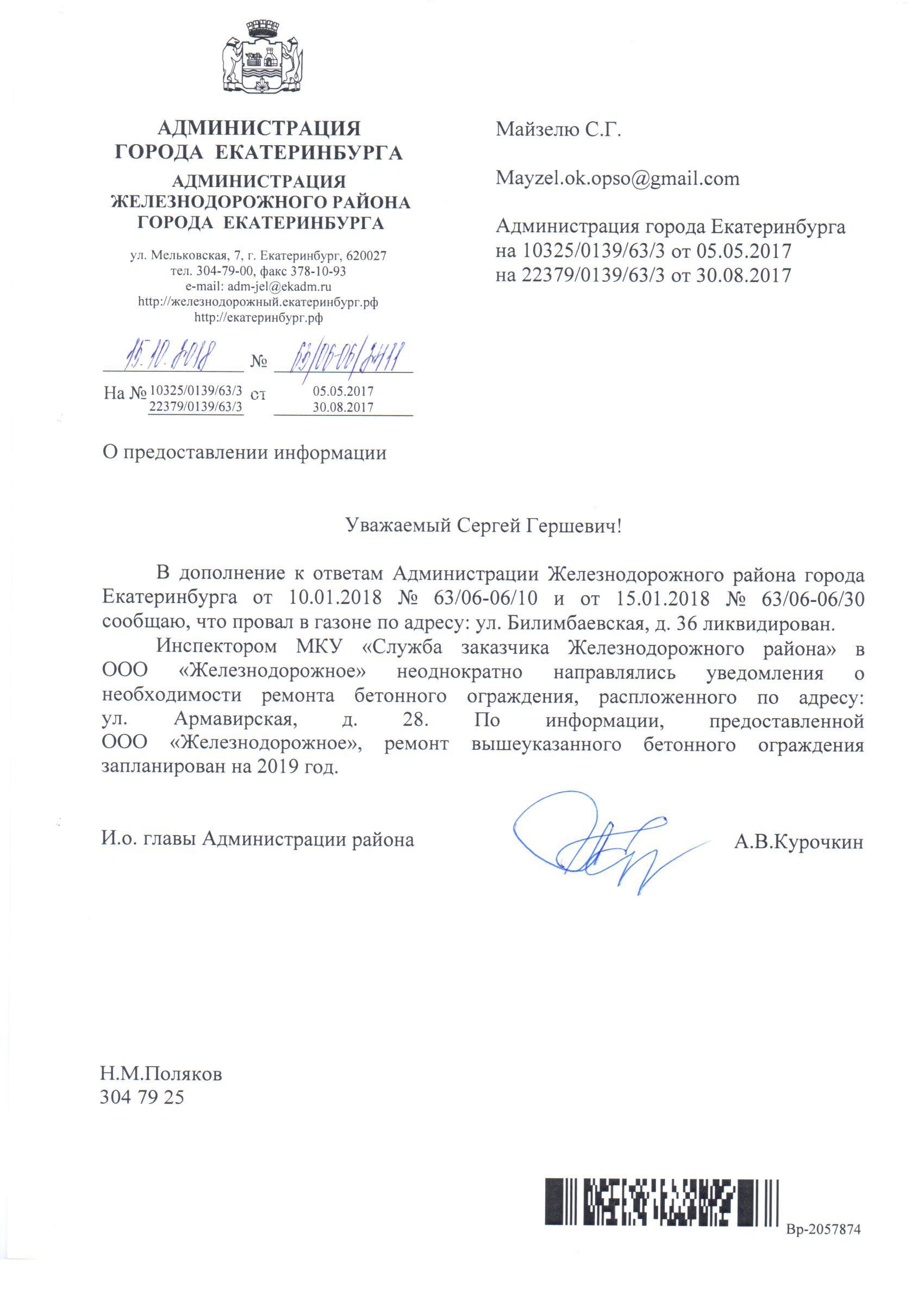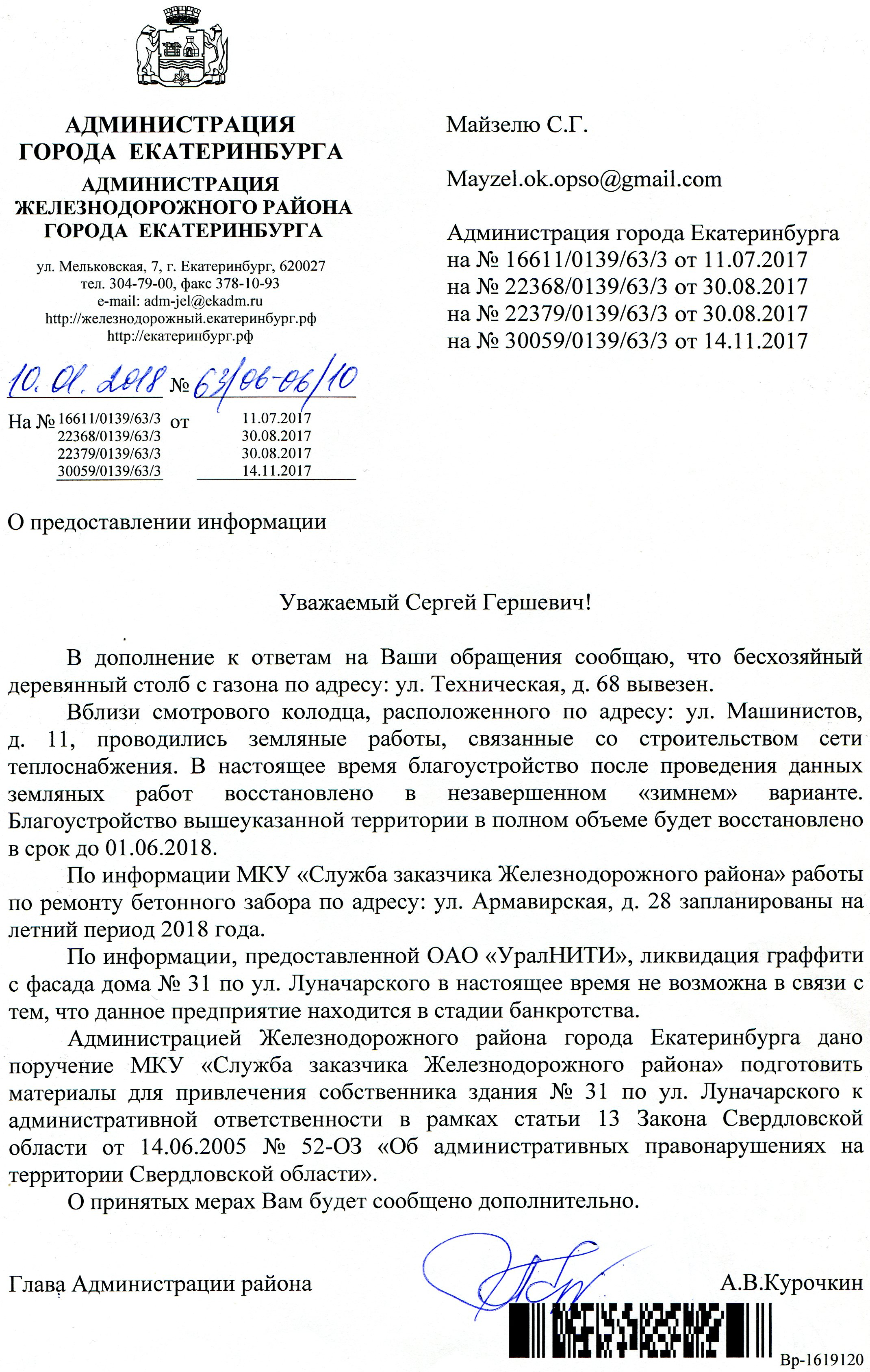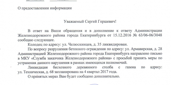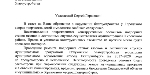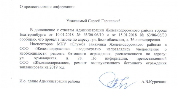 Номер жалобы:23638 Тип жалобы:Ненадлежащее содержание малых архитектурных форм Название объекта:Администрация Екатеринбурга Регион:Свердловская область Город:Екатеринбург Адрес:Армавирская ул., 28 Описание жалобы:Разрушение бетонного ограждения Статус:
