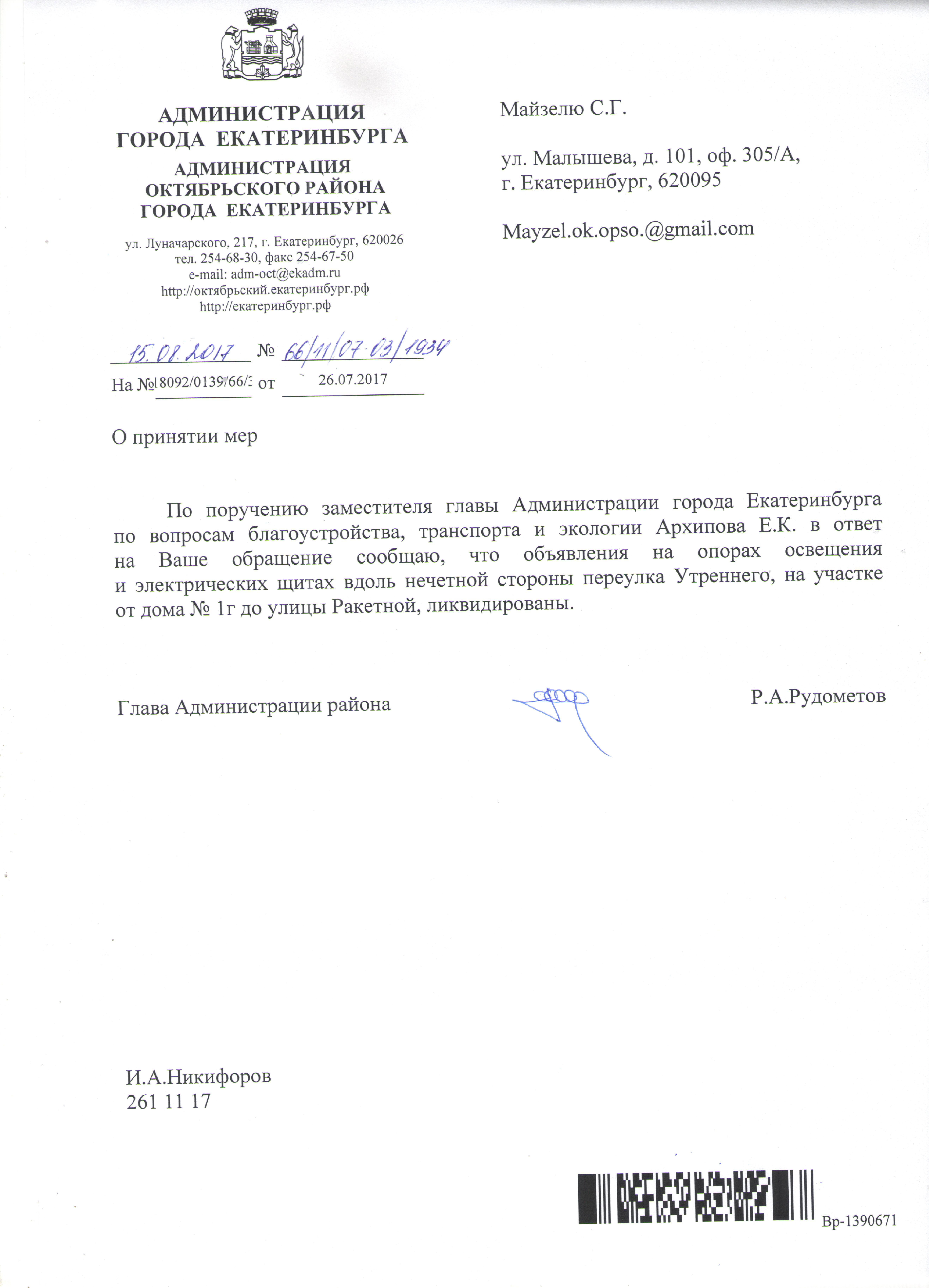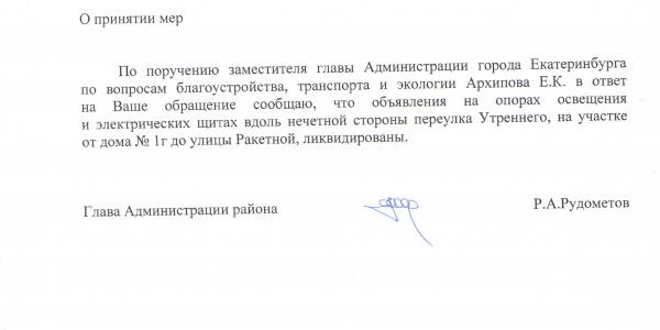 Номер жалобы:21871 Тип жалобы:Ненадлежащее содержание малых архитектурных форм Название объекта:Администрация Екатеринбурга Регион:Свердловская область Город:Екатеринбург Адрес:Утренний переулок, 1 г Описание жалобы:Объявления на опорах освещения и электрических щитах вдоль нечётной стороны переулка Утреннего на участке от дома 1г до улицы Ракетной. Статус: