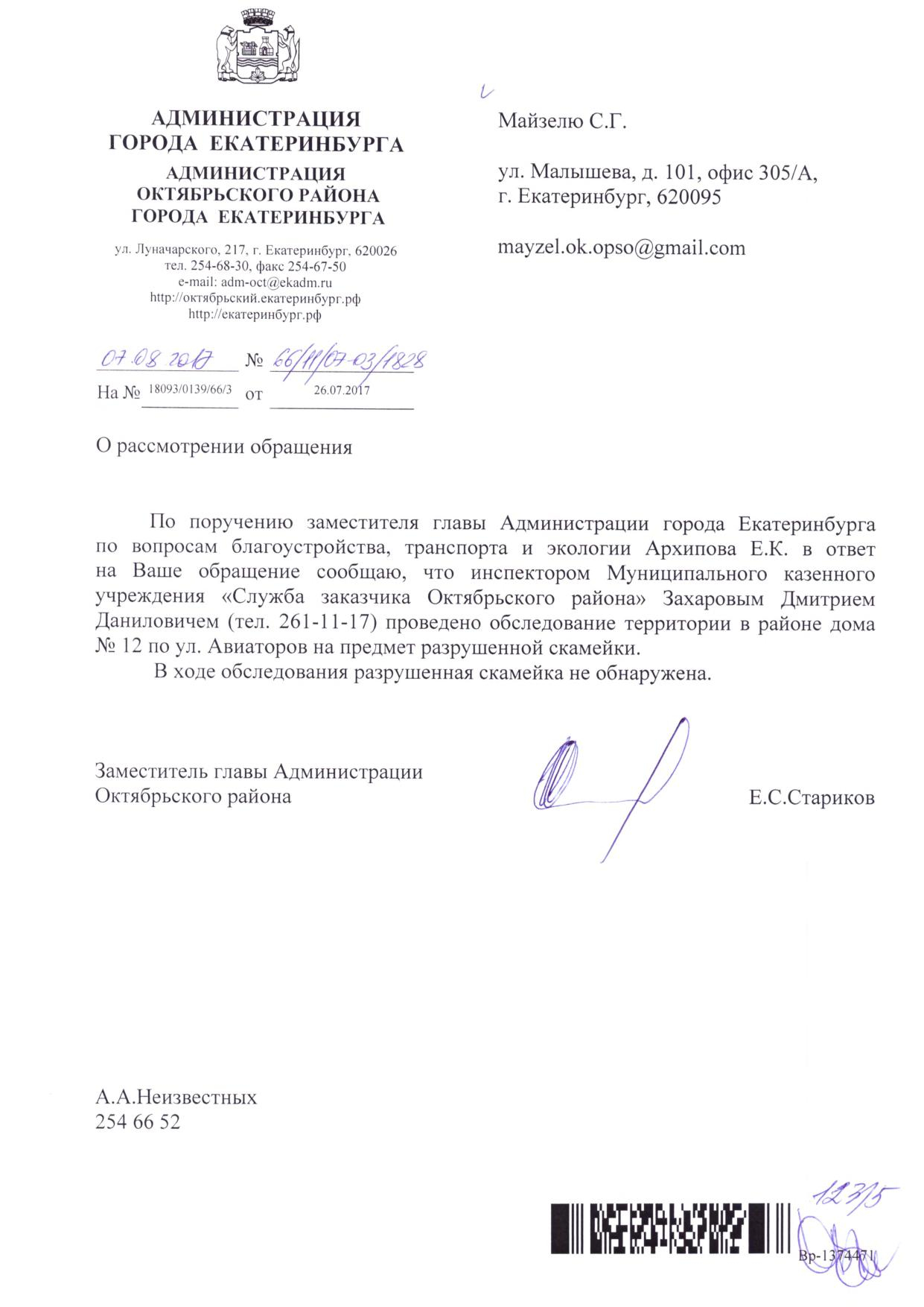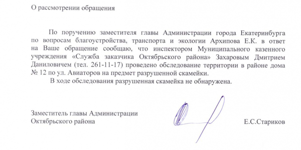 Номер жалобы:21901 Тип жалобы:Ненадлежащее содержание малых архитектурных форм Название объекта:Администрация Екатеринбурга Регион:Свердловская область Город:Екатеринбург Адрес:улица Авиаторов Описание жалобы:На перекрёстке улиц Авиаторов и Ракетной со стороны дома Авиаторов, 12 стоит скамейка без сидения, заклеенная объявлениями. Статус:
