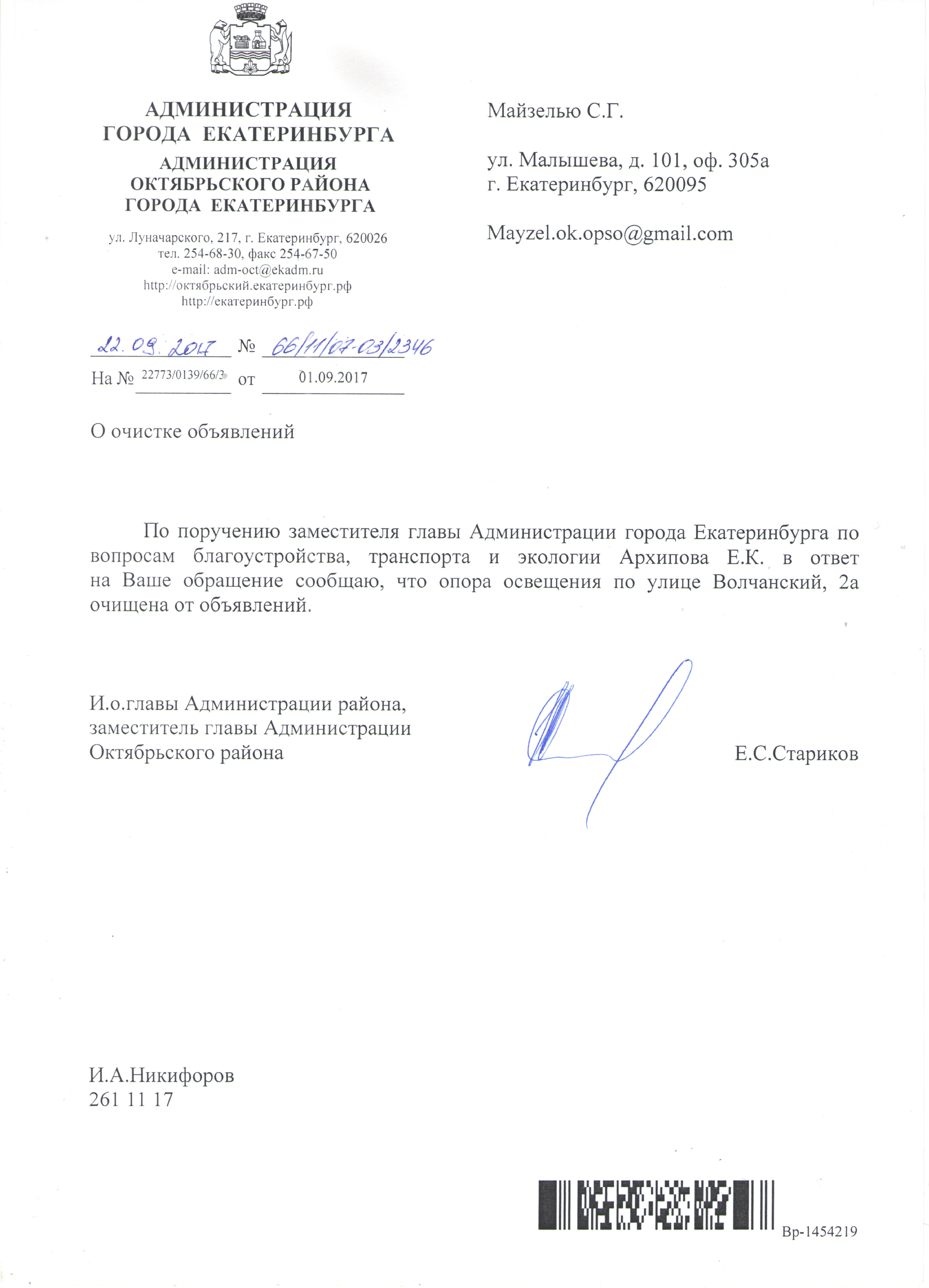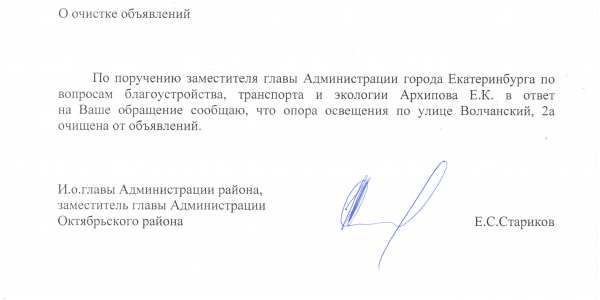 Номер жалобы:24231 Тип жалобы:Ненадлежащее содержание малых архитектурных форм Название объекта:Администрация Екатеринбурга Регион:Свердловская область Город:Екатеринбург Адрес:Волчанский, 2а Описание жалобы:С опор освещения вдоль Сибирского тракта не до конца удалены объявления. Статус: