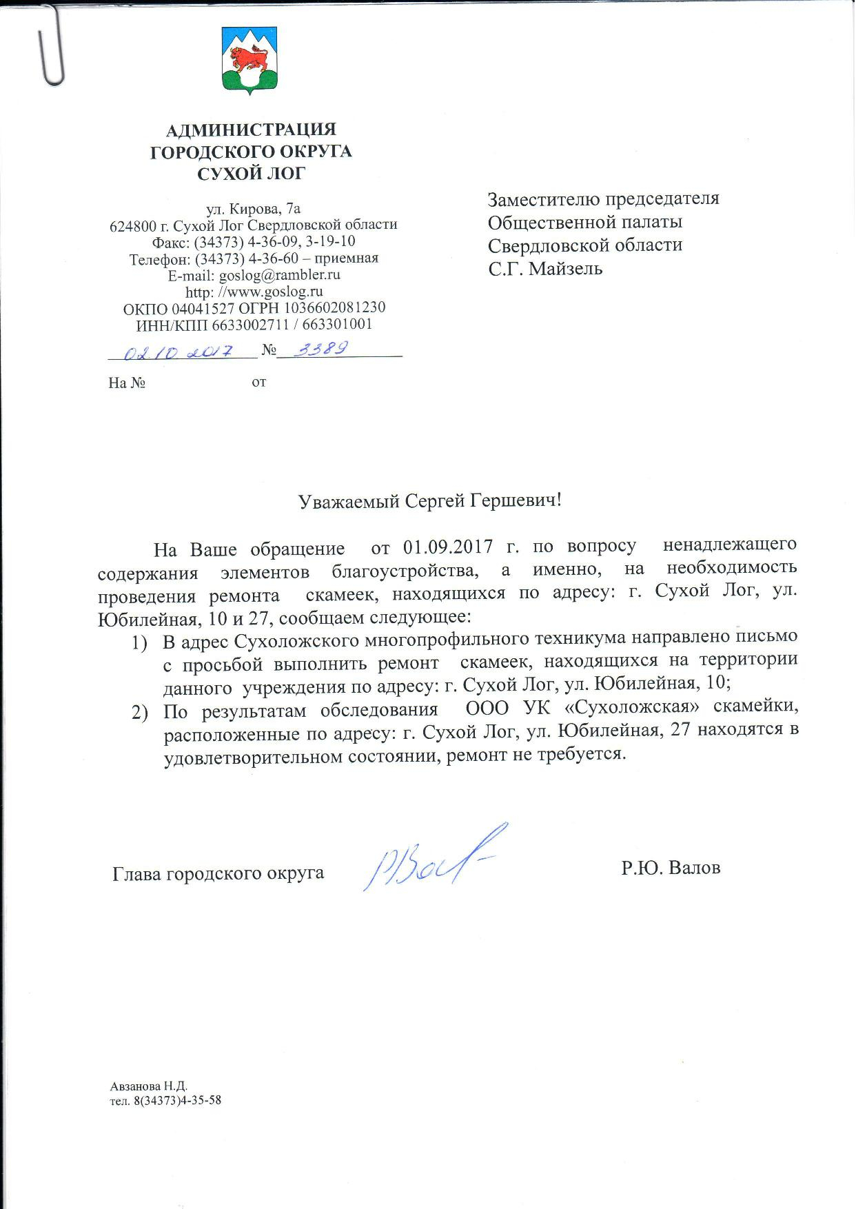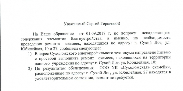 Номер жалобы:24284 Тип жалобы:Ненадлежащее содержание малых архитектурных форм Название объекта:Сухой Лог Регион:Свердловская область Город:Сухой Лог Адрес:Юбилейная, 10 Описание жалобы:Необходим ремонт лавочек по адресам Юбилейная, д.10 и д. 27 Статус: