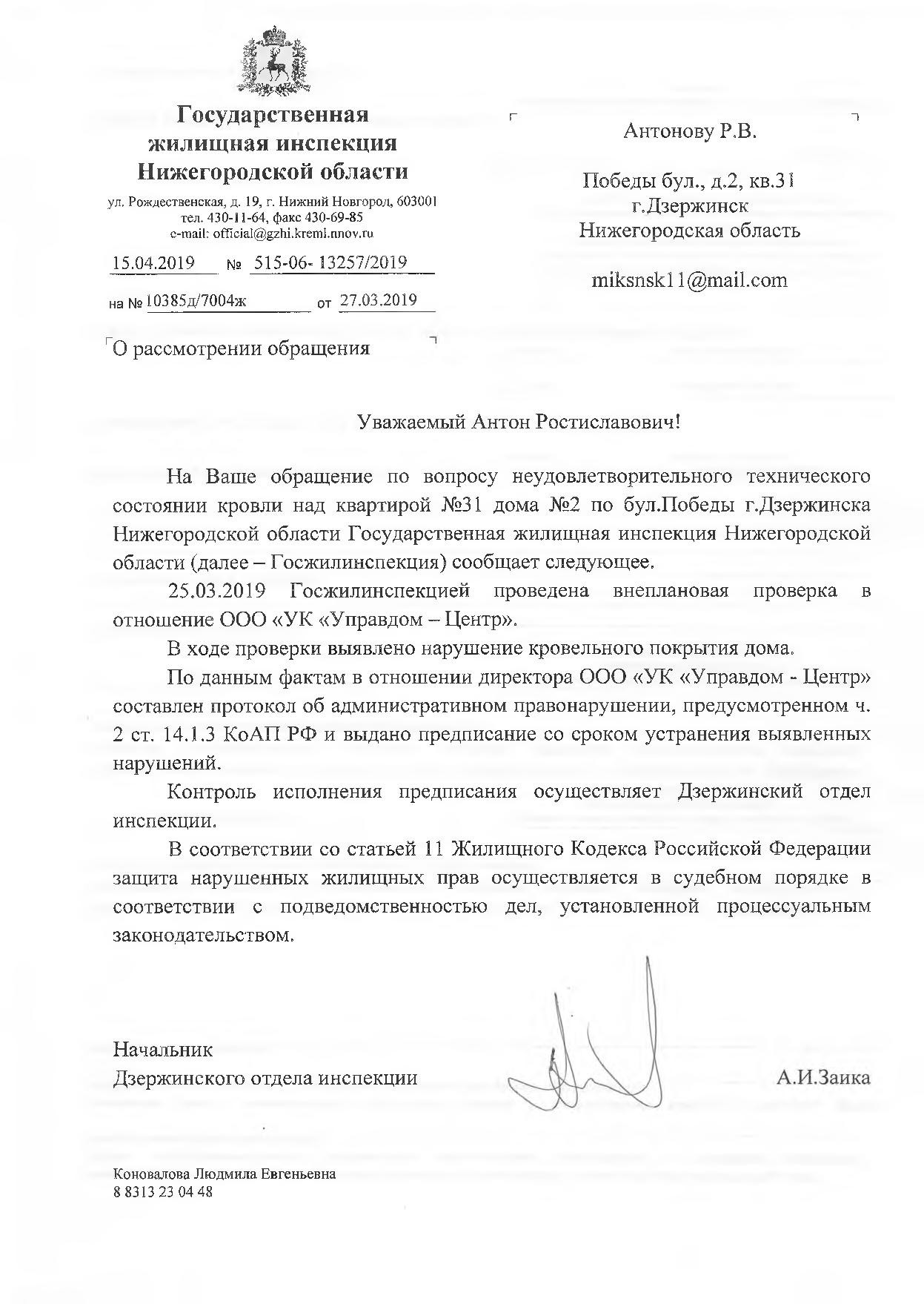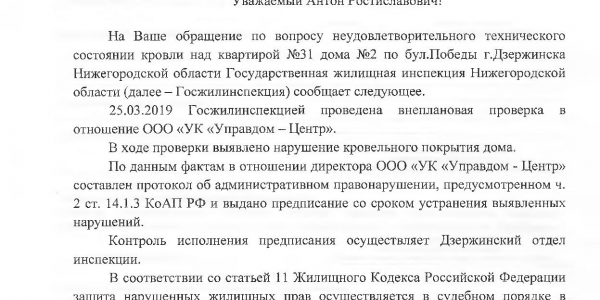 Номер жалобы:51305 Тип жалобы:Иные проблемы ЖКХ Название объекта:"УК"Управдом-Центр" Регион:Нижегородская область Город:Дзержинск Адрес:б-р.Победы, д.2, кв.31 Описание жалобы:Течь кровли в многоквартирном жилом доме. По этой причине в квартире верхнего этажа прогнили оконные рамы, на стенах под обоями плесень. Управляющая компания ничем помочь не может, только обещает до 30.09.2019г., отремонтировать кровлю. Такие обещания мы уже слышали. Так же управляющая компания игнорирует предписания прокуратуры и администрации (данная проблема существует с 2011г.) Просим Вас помочь в решении нашей проблемы. Статус: