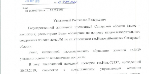 Номер жалобы:51324 Тип жалобы:Иные проблемы ЖКХ Название объекта:УК ЖУК Регион:Самарская область Город:Новокуйбышевск Адрес:Успенского 1-39 Описание жалобы:С 14.02.19 течёт вода с потолка в нашей квартире. На заявление в УК ЖУК - пришёл специалист, составил акт. Больше никаких действий со стороны УК не было. Ещё писали заявления, звонили- реакции ноль. Вода течёт с потолка и по стене внешней и на кухне и в двух комнатах. Вчера вода пошла к соседям , которые живут под нами ... боимся обрушения потолка ( в подъезде такое было).