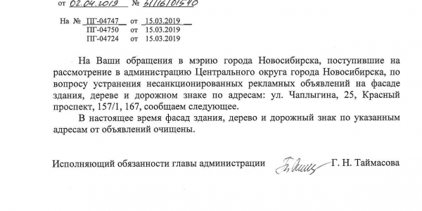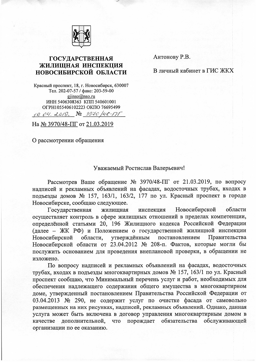 Номер жалобы:51263 Тип жалобы:Иные проблемы ЖКХ Название объекта: Регион:Новосибирская область Город:Новосибирск Адрес:Красный проспект, 167 Описание жалобы:Объявления в неположенном месте Статус:
