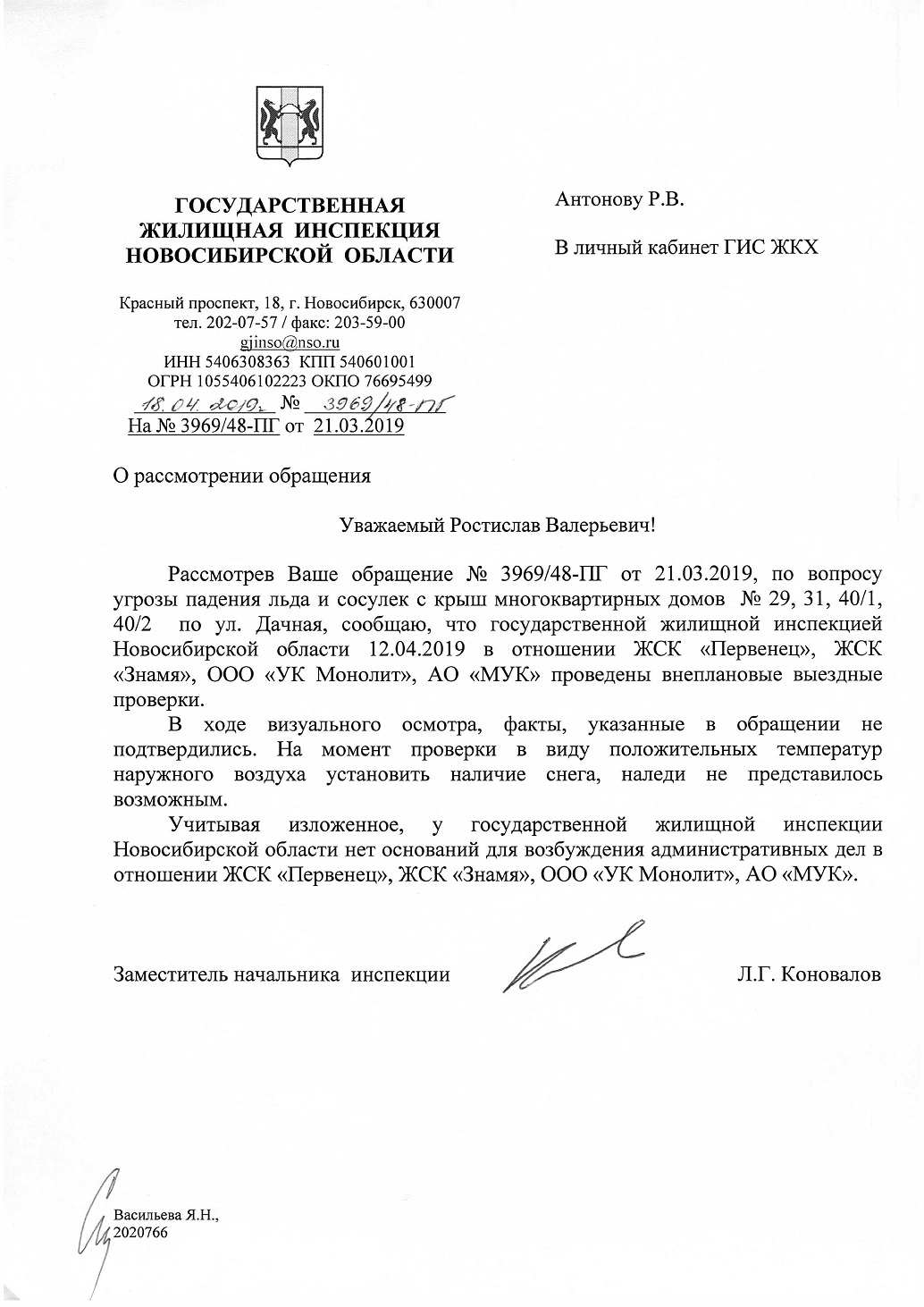Номер жалобы:51254 Тип жалобы:Иные проблемы ЖКХ Название объекта: Регион:Новосибирская область Город:Новосибирск Адрес:Дачная улица, 29 Описание жалобы:Сосульки на крыше дома Статус: