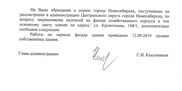 Номер жалобы:50644 Тип жалобы:Иные проблемы ЖКХ Название объекта: Регион:Новосибирская область Город:Новосибирск Адрес:улица Кропоткина, 108/1 Описание жалобы:Надписи на фасаде хозяйственного корпуса закрашены не в тон Статус: