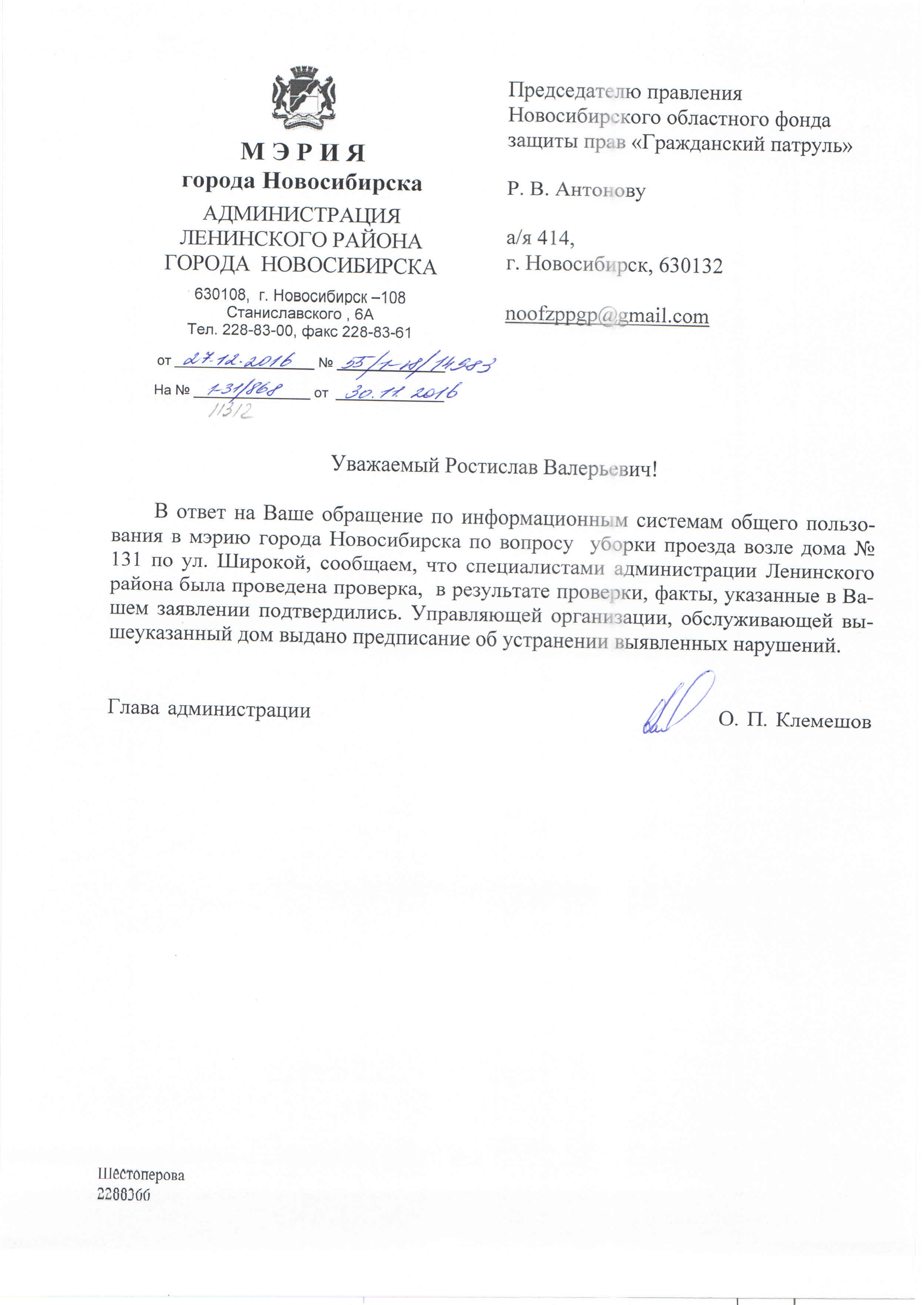 Номер жалобы:11298 Тип жалобы:Качество уборки снега во дворе Название объекта:Управляющая Компания Город:Новосибирск Адрес:Новосибирск, улица Троллейная, 24 Описание жалобы:Снег во дворе Статус: