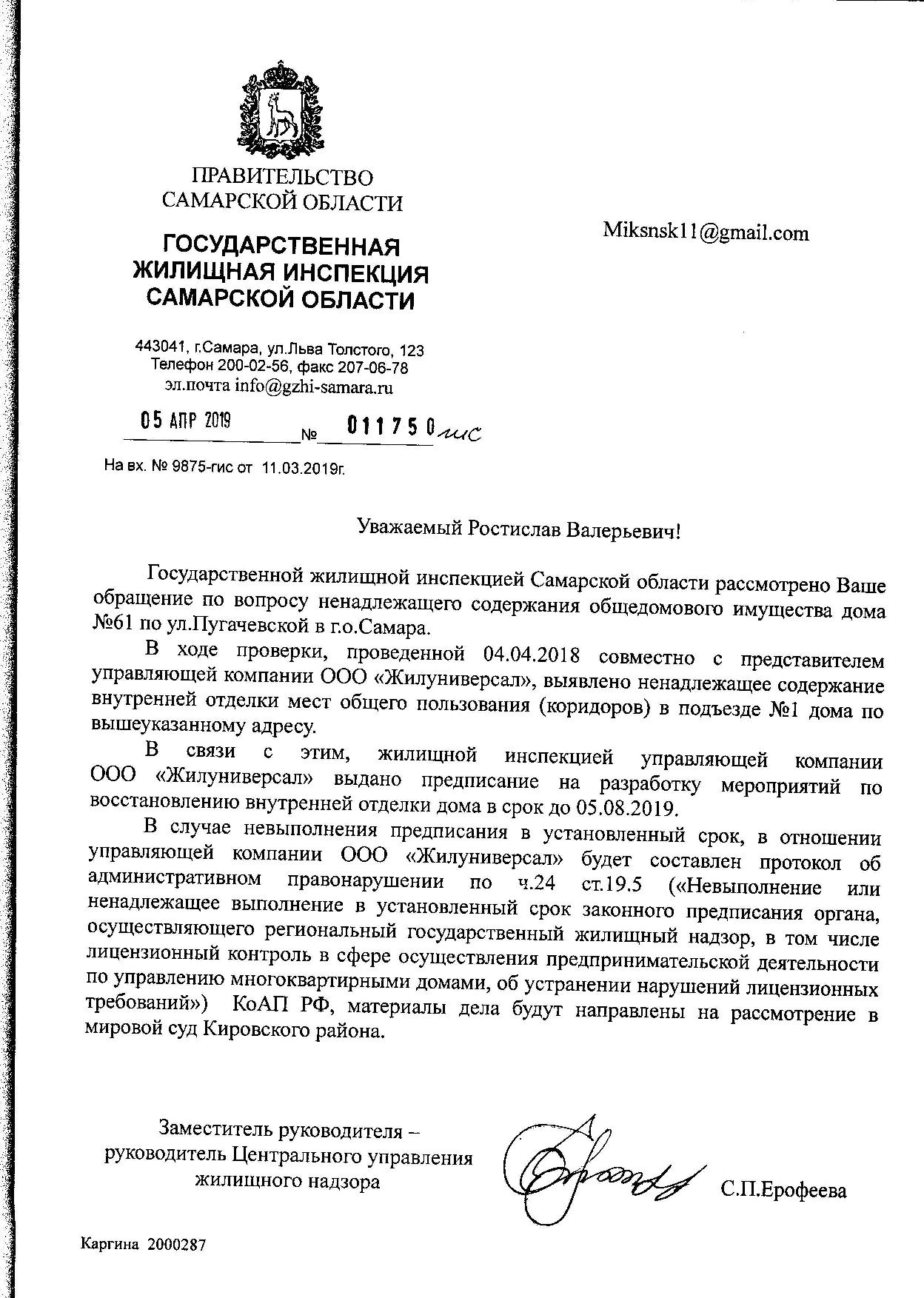 Написано обращение в интернет-приемную губернатора Аароваа Д.И., в ответе от 04.02.19г. Д-9/01899 наше обращение направлено врио руководителя ГЖИ Самарской обл. Катковой В.А., главе г.о.Самара Лапушкиной Е.В.