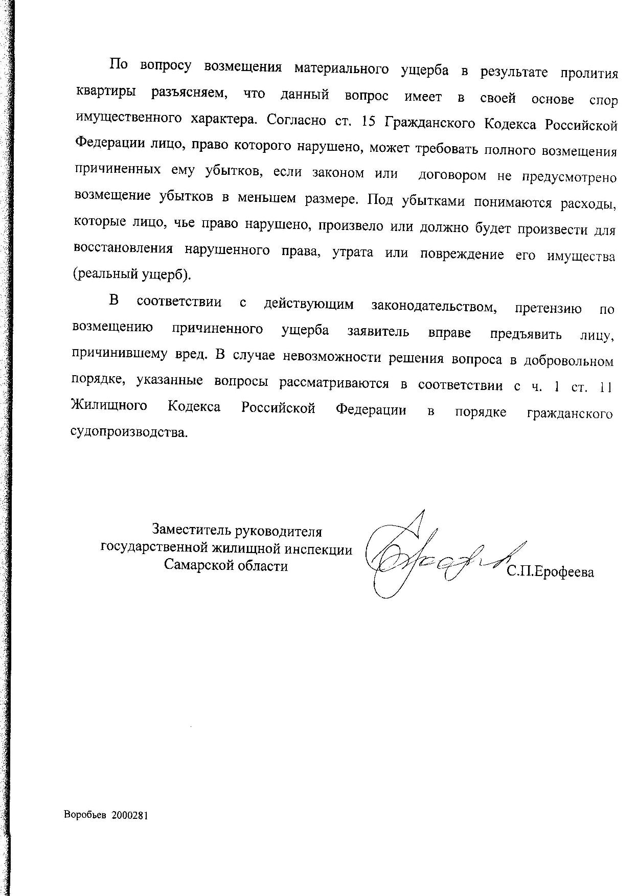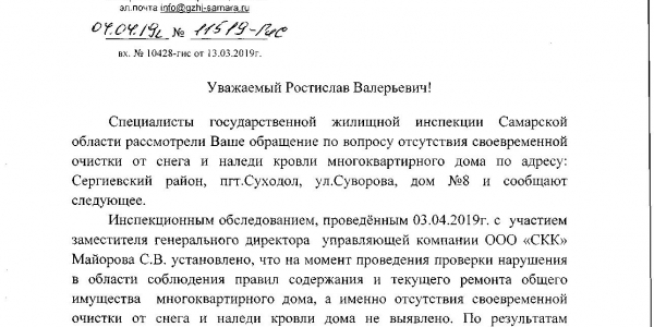 Затем пришел ответ 05.02.19г. 06-09/2865-1190/19/02 от Администрации г.о. Самара, что мое обращение направлено в Администрацию Октябрьского района г.о.Самара. Результата на данный момент нет. Кровля не чищена и течет.