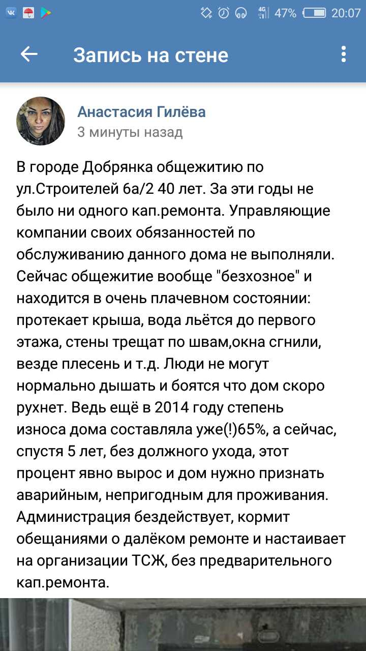 Номер жалобы:50492 Тип жалобы:Иные проблемы ЖКХ Название объекта: Регион:Пермский край Город:Добрянка Адрес:переулок Строителей, 6АК1 Описание жалобы:https://vk.com/wall-101040992_1950 вся информация и видео здесь. Статус: