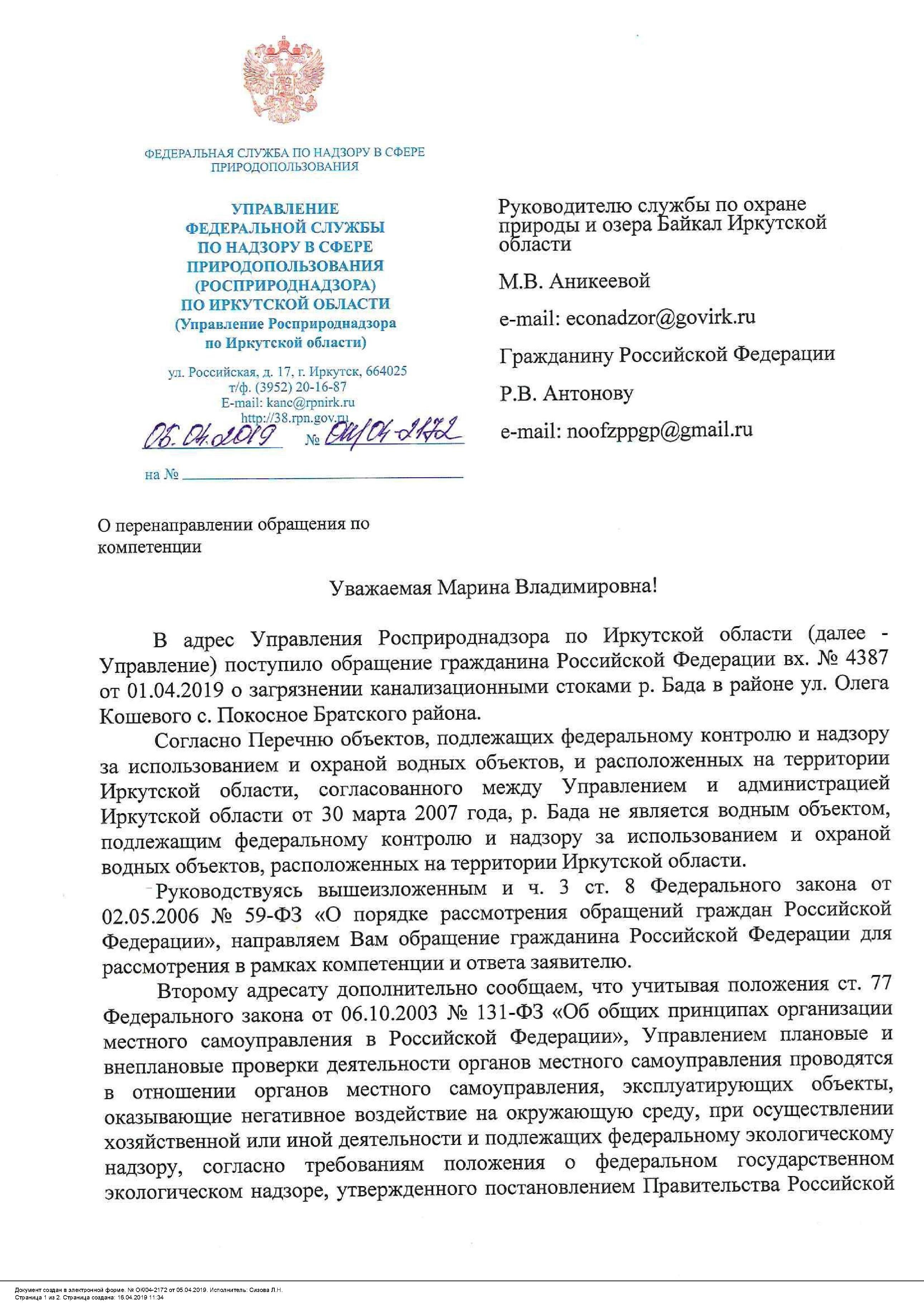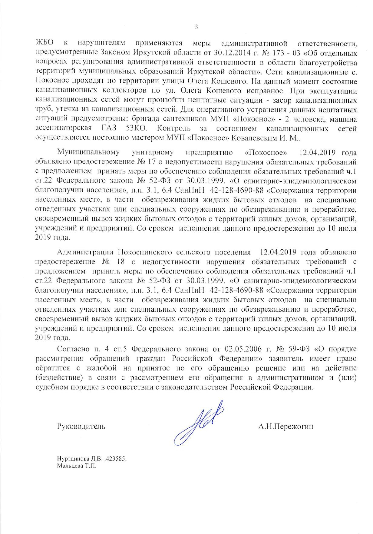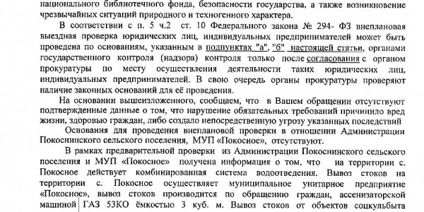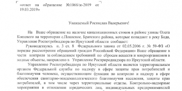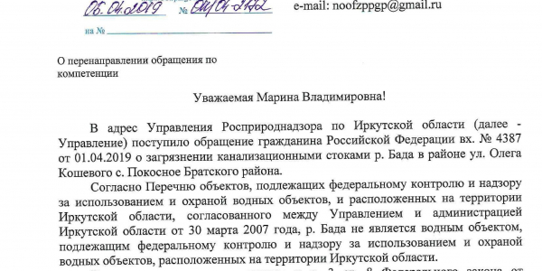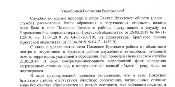 Номер жалобы:50498 Тип жалобы:Иные проблемы ЖКХ Название объекта:Жкх и глава администрации Регион:Иркутская область Город:село Покосное Адрес:ул. О. Кошевого Описание жалобы:Здравствуйте нужна помощь как достучаться до кого нибудь по центральной улице Ол.Кошевого по улице бежит канализация все во дворы местным жителям и реку Бада которая попадает в Ангару может к зеленым обратиться по тому что глава администрации не может справиться помогите пожалуйста Статус: