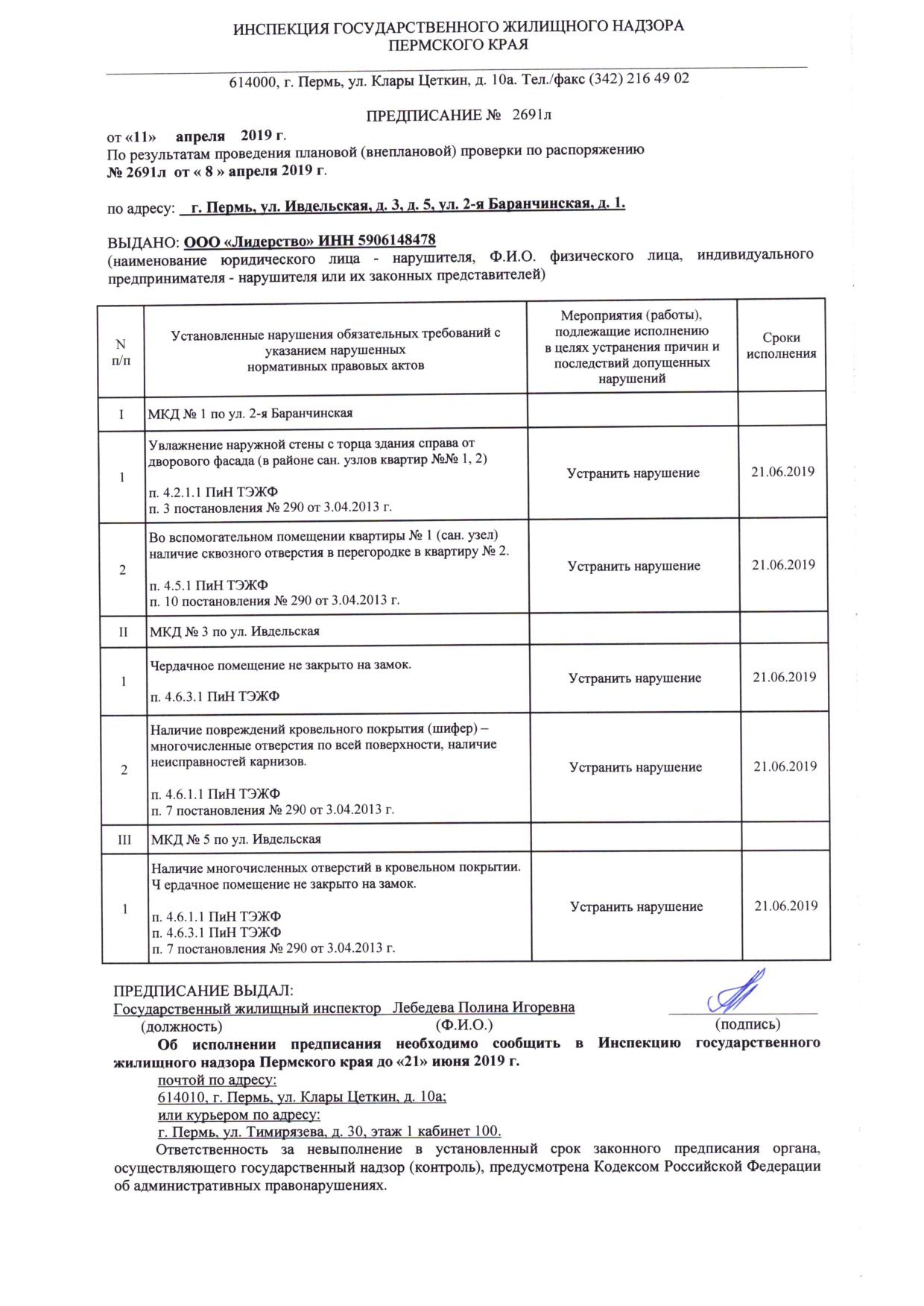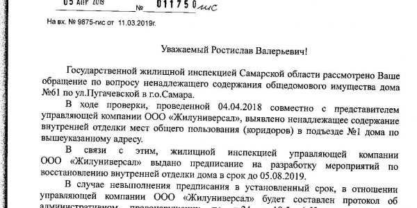 12.09.18г. написано заявление в Гос.жилищную инспекцию Самарской обл. (ГЖИ) с описанием данной проблемы. ГЖИ вынесло предписание УК ООО «ЖКС» на устранение нарушения в срок до 09.11.18г. Ремонт не произведен. Выдано повторное предписание об устранении выявленного нарушения в срок до 14.12.18г. И снова от УК нет никаких действий. В январе 2019г. выдано третье предписание устранить нарушение в срок до 31.05.19г.