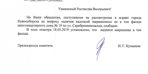 Номер жалобы:50436 Тип жалобы:Иные проблемы ЖКХ Название объекта: Регион:Новосибирская область Город:Новосибирск Адрес:Серебренниковская улица, 19 Описание жалобы:Надписи на фасаде дома закрашены не в тон Статус: