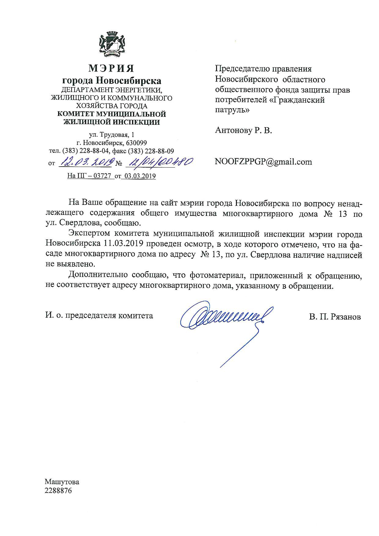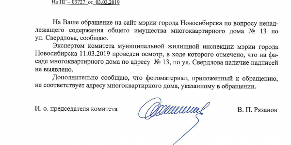 Номер жалобы:50355 Тип жалобы:Иные проблемы ЖКХ Название объекта: Регион:Новосибирская область Город:Новосибирск Адрес:улица Свердлова, 13 Описание жалобы:Надписи на фасаде дома Статус: