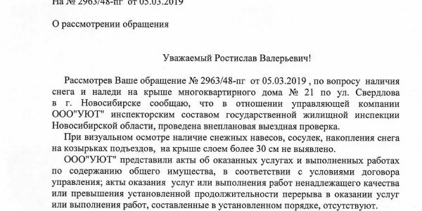 Номер жалобы:50364 Тип жалобы:Иные проблемы ЖКХ Название объекта: Регион:Новосибирская область Город:Новосибирск Адрес:Новосибирск, улица Свердлова, 21 Описание жалобы:Снег на крыше дома Статус: