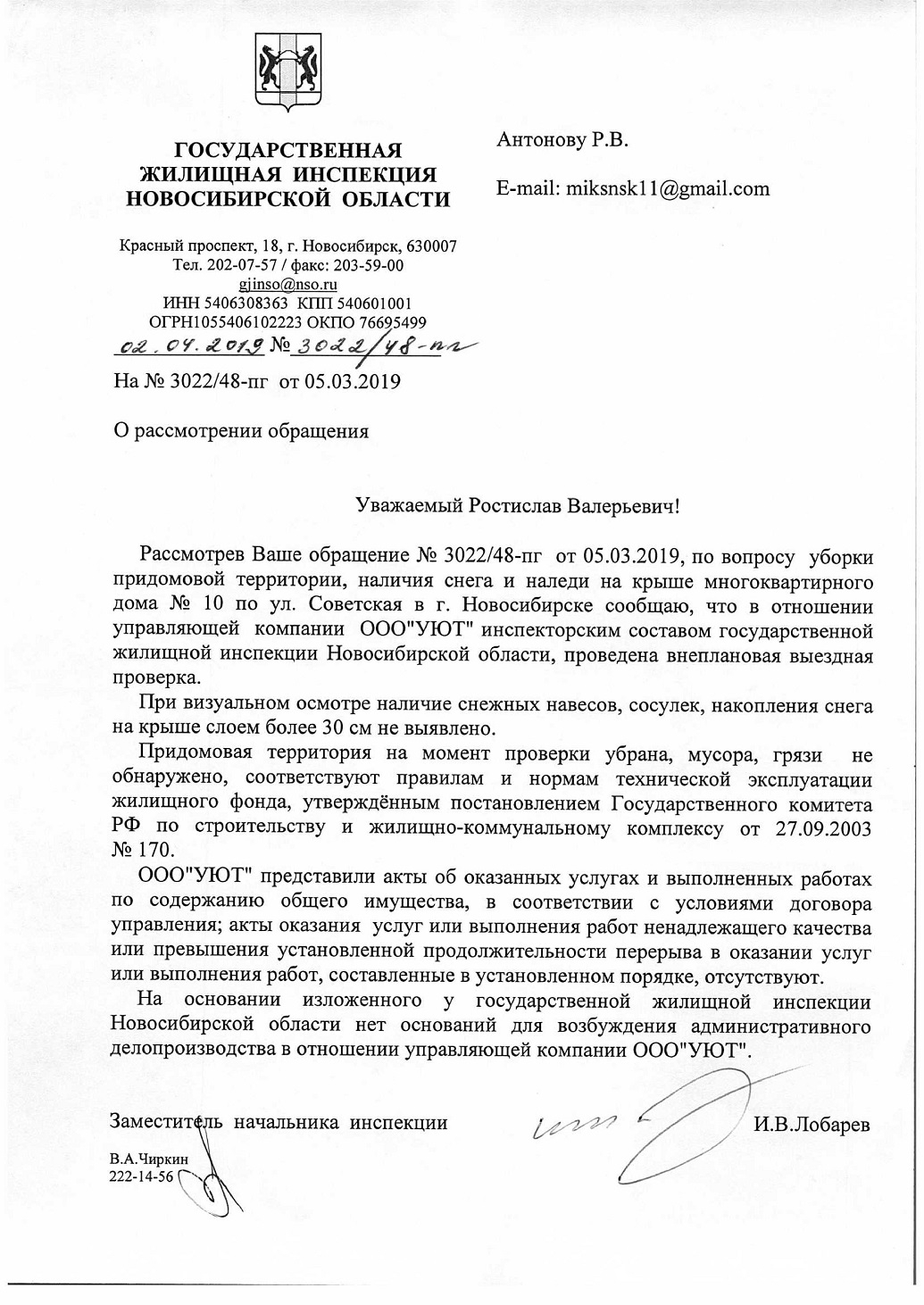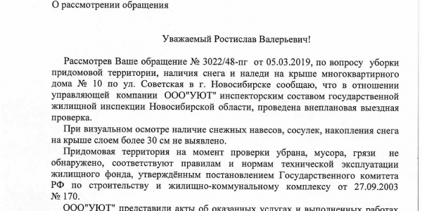 Номер жалобы:50345 Тип жалобы:Иные проблемы ЖКХ Название объекта: Регион:Новосибирская область Город:Новосибирск Адрес:Советская улица, 10 Описание жалобы:ООО "УЮТ"