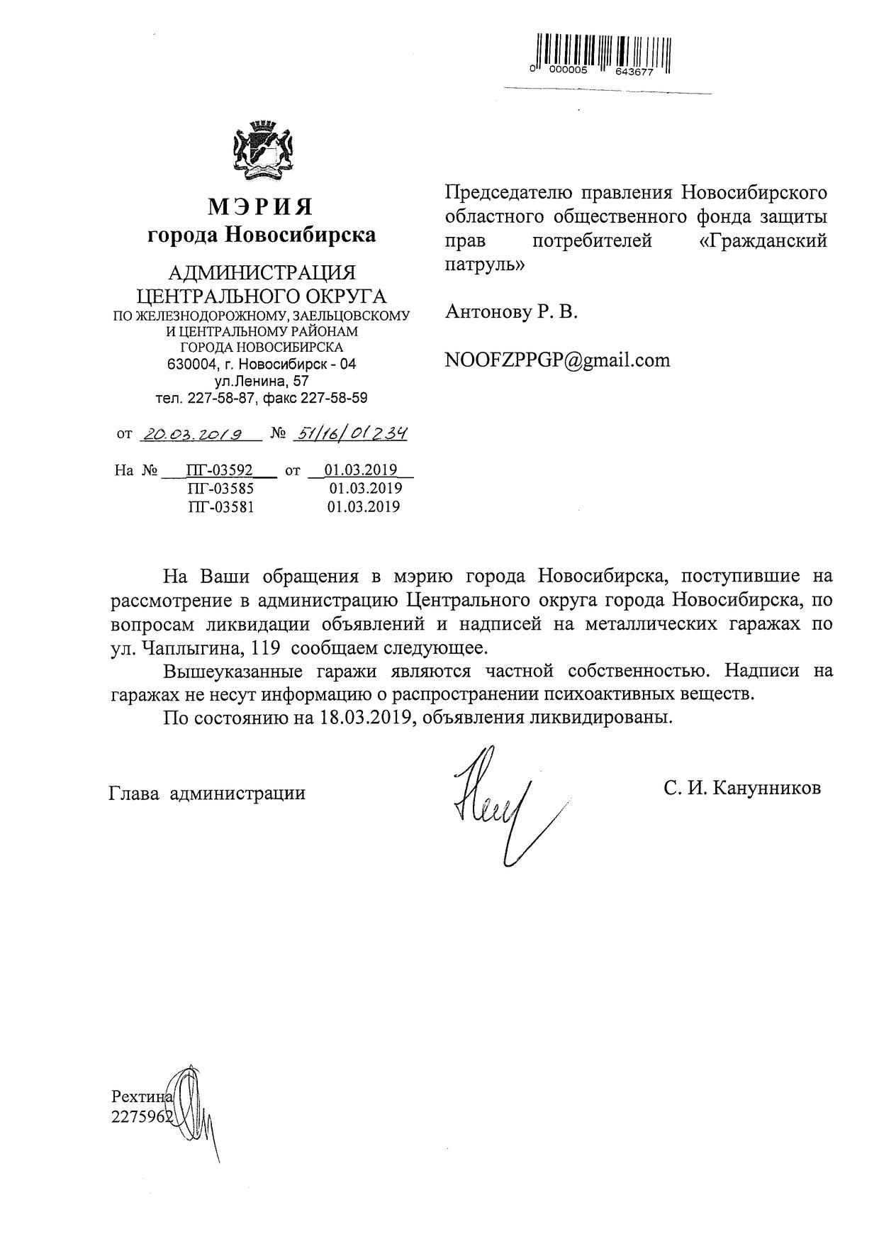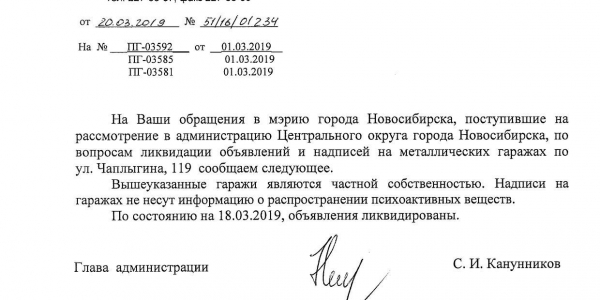 Номер жалобы:50338 Тип жалобы:Иные проблемы ЖКХ Название объекта: Регион:Новосибирская область Город:Новосибирск Адрес:улица Чаплыгина, 119 Описание жалобы:Объявления на гараже Статус: