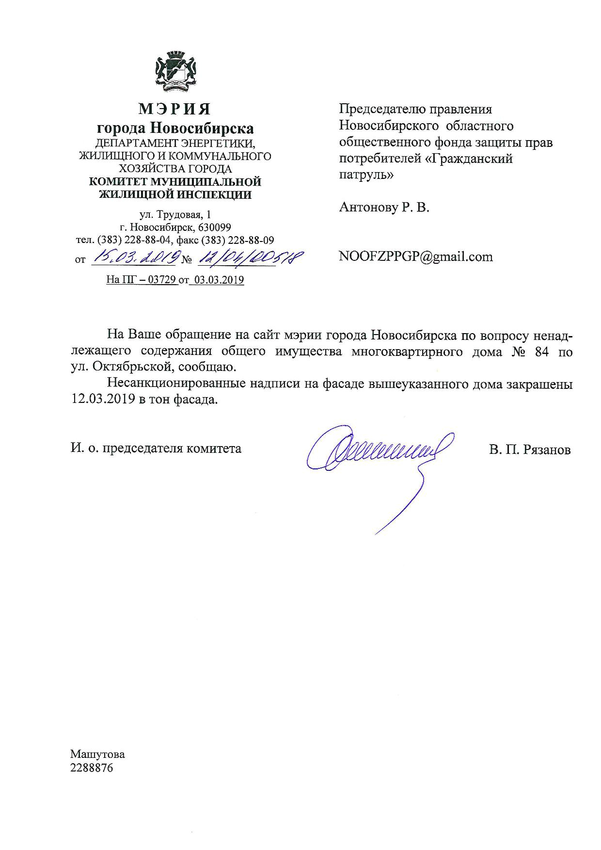 Номер жалобы:50340 Тип жалобы:Иные проблемы ЖКХ Название объекта: Регион:Новосибирская область Город:Новосибирск Адрес:Октябрьская улица, 84 Описание жалобы:Надписи на фасаде дома Статус:
