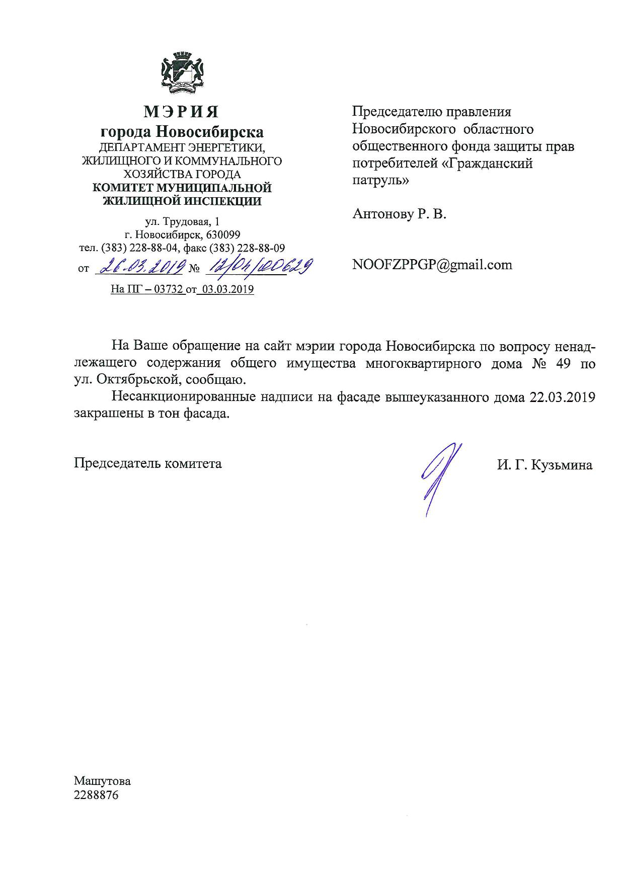 Номер жалобы:50342 Тип жалобы:Иные проблемы ЖКХ Название объекта: Регион:Новосибирская область Город:Новосибирск Адрес:Октябрьская улица, 49 Описание жалобы:Надписи на фасаде дома Статус: