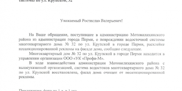 Номер жалобы:50277 Тип жалобы:Иные проблемы ЖКХ Название объекта: Регион:Пермский край Город:Пермь Адрес:улица Крупской, 32 Описание жалобы:повреждена водосточная труба, расклейка объявлений в неположенном месте Статус:
