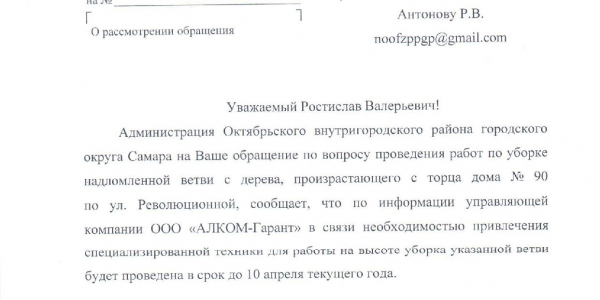 Номер жалобы:50305 Тип жалобы:Городская среда Название объекта: Регион:Самарская область Город:Самара Адрес:Революционная 90 Описание жалобы:Сухая вершина тополя упала на днях после сильной метели возле дома, со стороны улицы Артемовская. По счастью никто не пострадал и ничего не повреждено. Утром люди убрали с отмостки дома куски древесины и сучки. Но основная масса осталась висеть в воздухе, зацепившись за сучки других деревьев. Сейчас это представляет огромную опасность для проходящих про придомовой дорожке людей. Небольшой ветер и бревно упадет на голову случайным прохожим. В торце здания находится магазин и жители дома регулярно ходят туда, подвергаясь опасности. Статус: