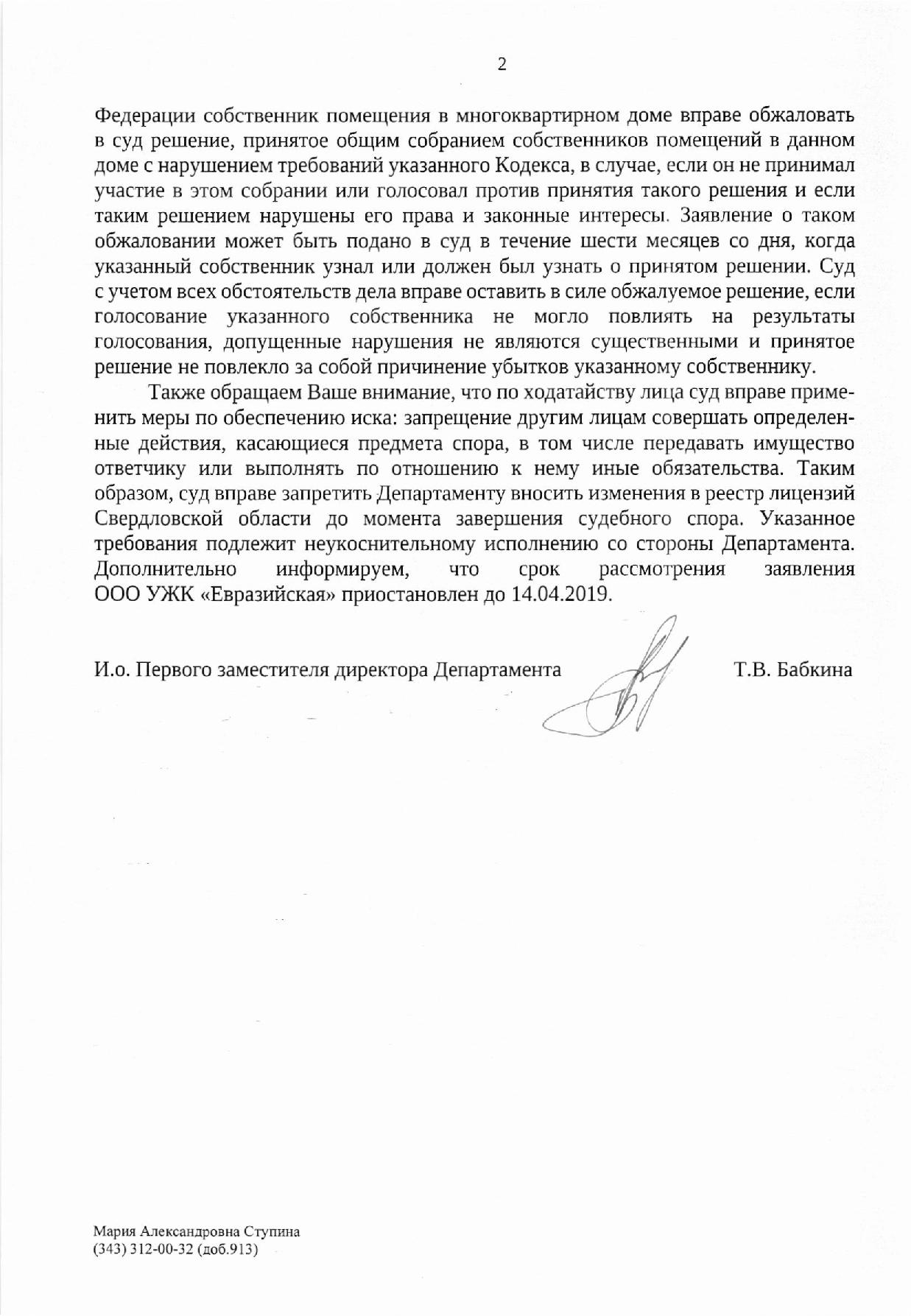 Номер жалобы:49617 Тип жалобы:Иные проблемы ЖКХ Название объекта:ООО УЖК "Евразийская" Регион:Свердловская область Город:посёлок Совхозный Адрес:Предельная улица, 20 Описание жалобы:Мошенничество. Представители этой компании ходят по нашему району и вводя в заблуждение просят подписать этот бланк. Говорят, что по их договору с УК Ирюм они просто будут делать ремонт в подъезде. А по факту просят передать им все полномочия. Ситуация такая: не сразу разобрав ситуацию и будучи введённой в заблуждение я поставила галочки "за" в пунктах о капремонте и перерасчете оплаты отопления. Поставила галочку "против" в пункте 5 о передаче прав. Вопрос: что сейчас делать? Обратилась в УЖК "Европейская" с просьбой вернуть мне мой подписанный бланк, сказали, что вернут, но ещё не вернули. Прилагаю копию бланка, с которыми они ходят. Статус: