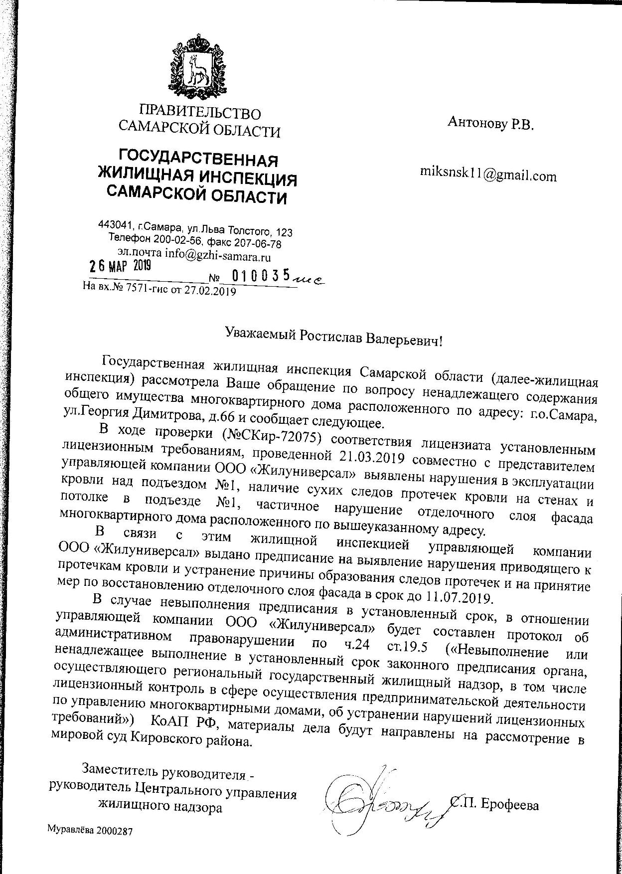 Номер жалобы:49912 Тип жалобы:Иные проблемы ЖКХ Название объекта: Регион:Самарская область Город:Самара Адрес:Самара, улица Гагарина, 165А Описание жалобы:НАША УК Компания ООО "ЖКС" ИНН 6316201681. В ноябре 2018 года перекрыли кровлю дома по адресу г. Самара, ул. Гагарина, 165а над 2 и 3 подъездами. На данный момент весь дом протекает, там где ремонт был частичный, вода попадает под высоковольтный щиток. (3 и 4 подъезд). На телефонные звонки старшей по дому с просьбой исправить ситуацию, никто не реагирует. Фото второго подъезда прикладываю. Прошу принять меры по исправлению ситуации. Статус: