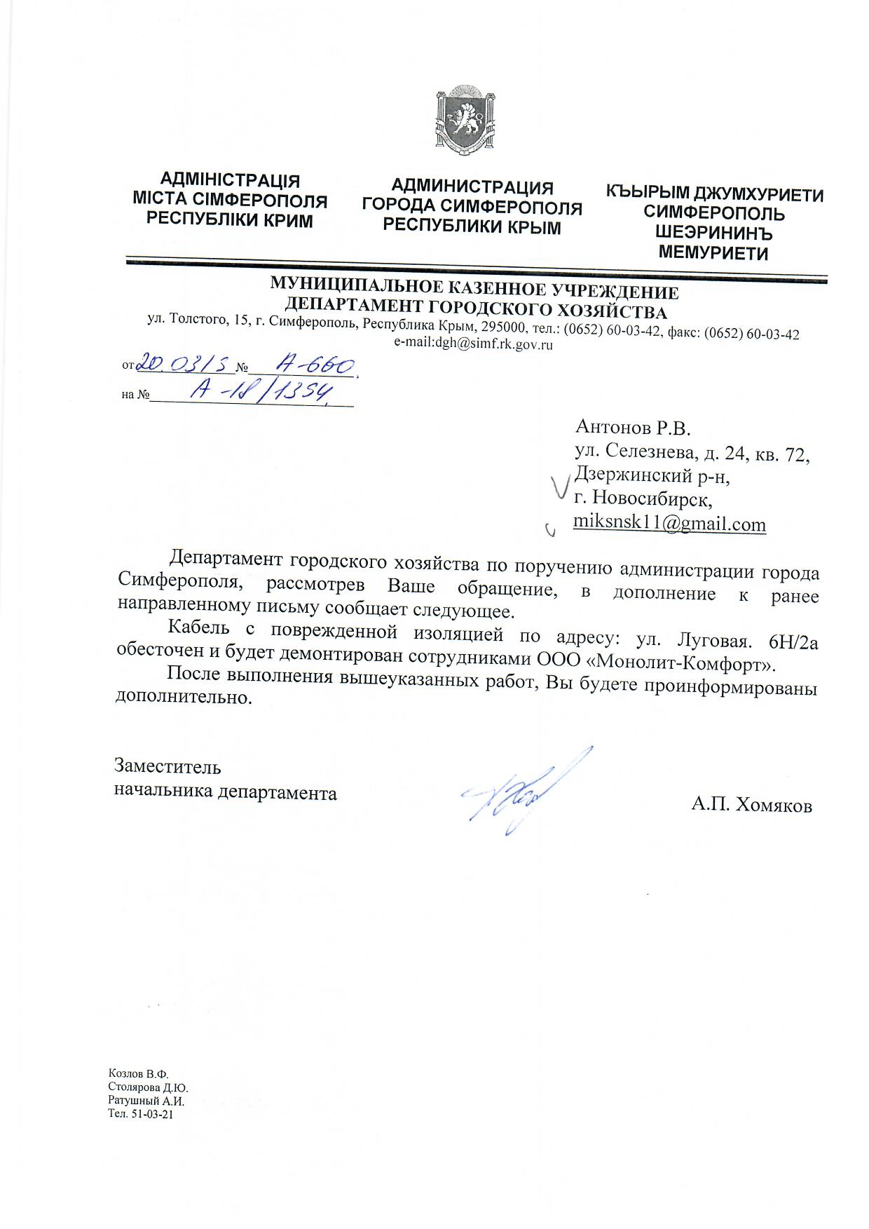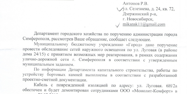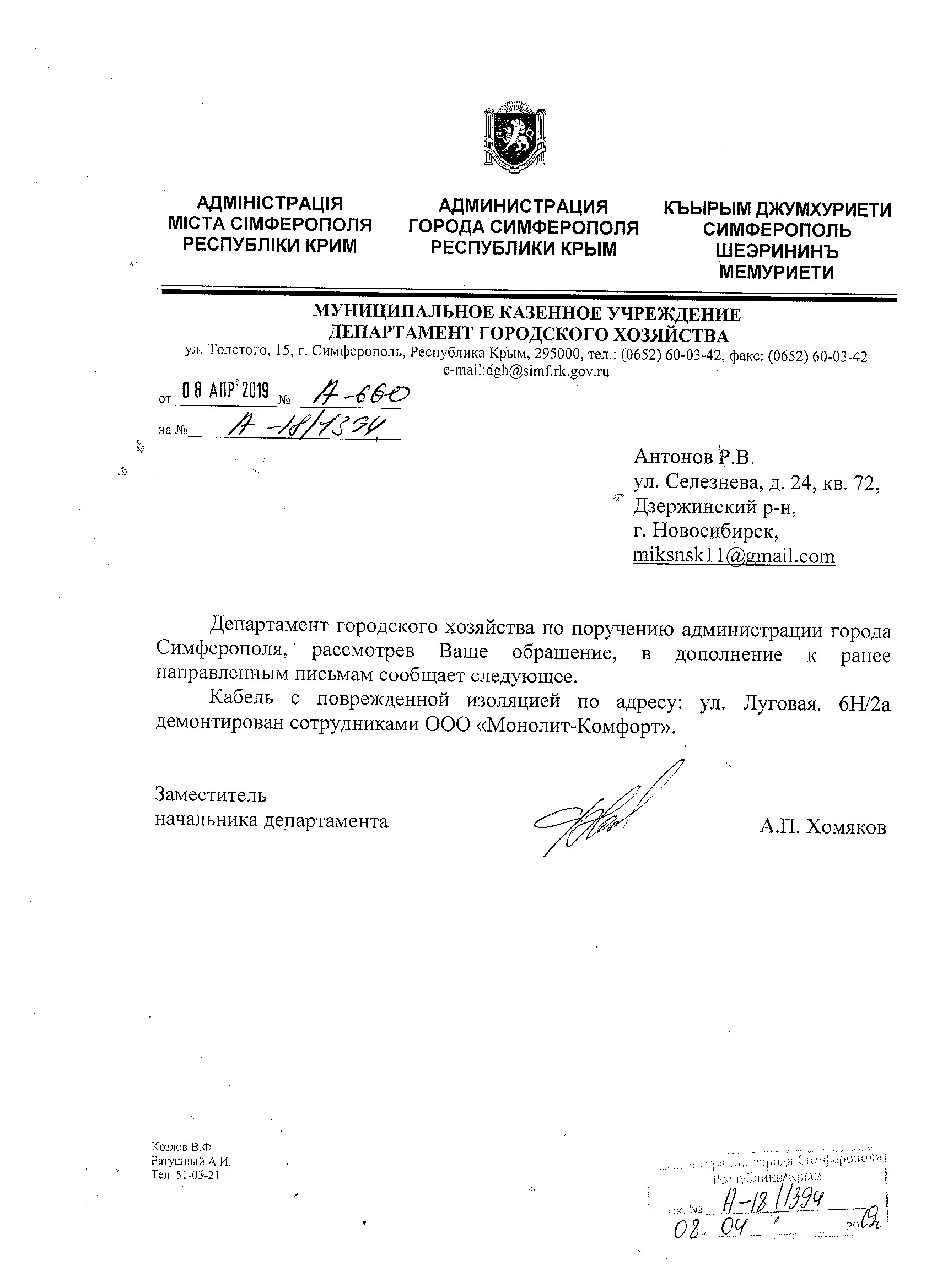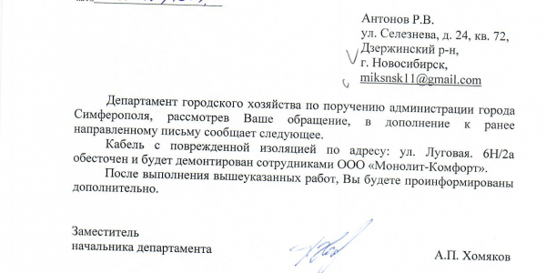 Номер жалобы:49122 Тип жалобы:Иные проблемы ЖКХ Название объекта: Регион:Республика Крым Город:Симферополь Адрес:Луговая улица, 6Н/2Ак1 Описание жалобы:Кабель с поврежденной изоляцией проложен по газону к подстанции, вдоль жилого дома, лежит с декабря 2018, рядом детская площадка. Минэнерго Респ. Крым.