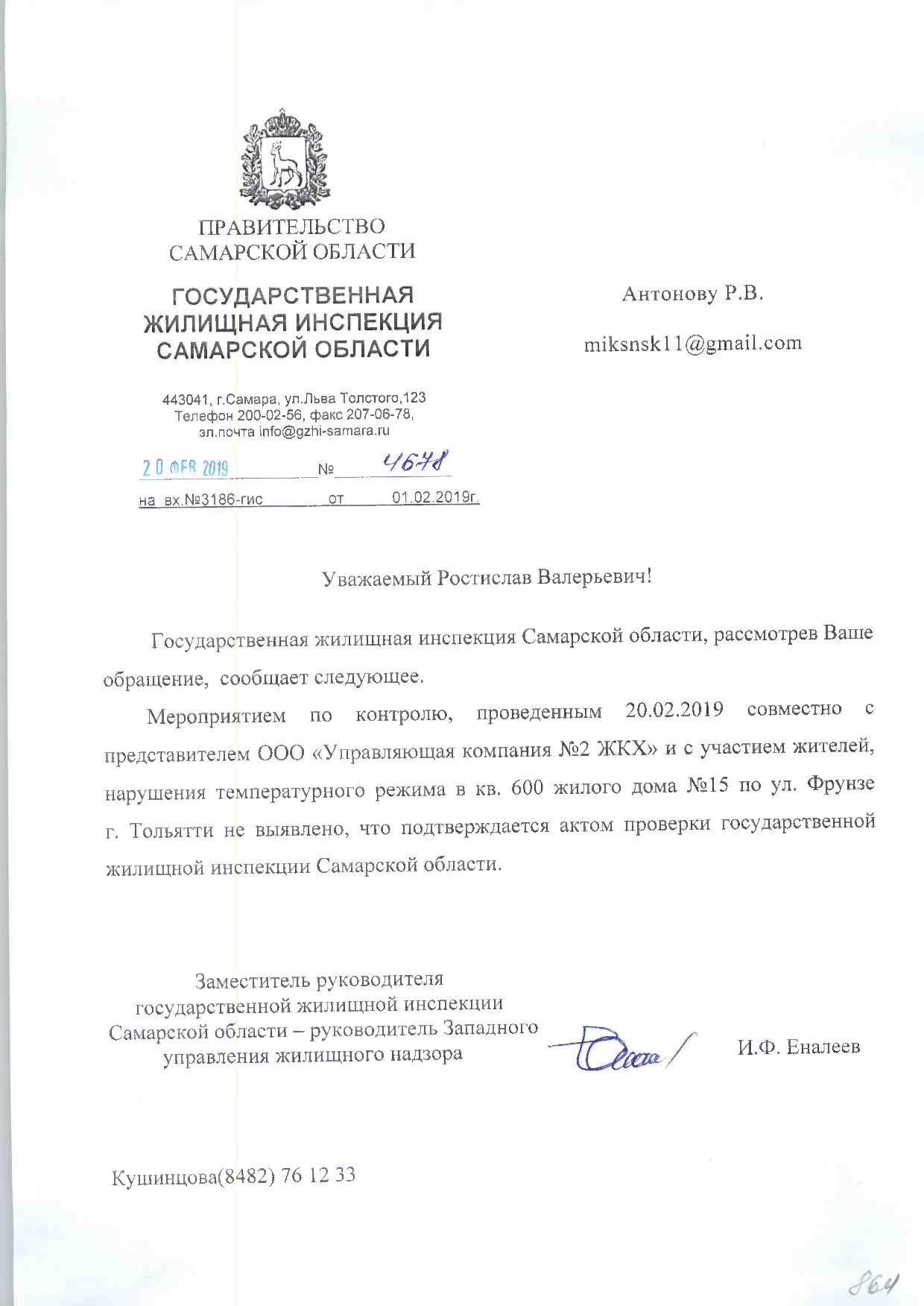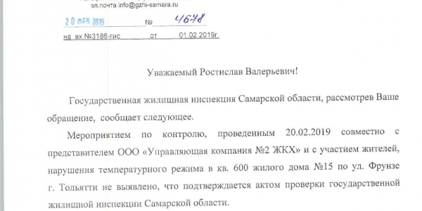 Номер жалобы:49135 Тип жалобы:Иные проблемы ЖКХ Название объекта: Регион:Самарская область Город:г. Тольятти Адрес:ул. Фрунзе, 15, кв 600 Описание жалобы:Добрый вечер. По поводу нашего дома, а вернее всего стояка, в 9тиэтажном доме. Угловые квартиры. К сожалению документов я вам не смогу предоставить так как выбросила их. Объясняю почему. В прошлом году я занялась этой проблемой. У нас в квартире (и по всему стояку в принципе) температура была не более 18-19 градусов. Окна пластиковые все почернели, углы и потолок почернел. Да и вообще очень холодно. У меня трое детей, младшей на тот момент 1,5 было. Я ходила в УК но они изверив прибором сказали что это всё нормально и жить можно. Я составила жалобу общественную и собрала подписи от всех жильцов. Отнесла в УК. Пришли, ещё раз всё посмотрели и заявили, что доктор Комаровский детям рекомендует не более 19 градусов им это полезно и у нас как раз всё нормально. Написала обращение в интернете губернатору. Забегали все сразу. Приходили ещё раза 3-4 всё меряли температуру. Итог такой: пришло тепло к нам. Мы были все ОЧЕНЬ рады. Я и выбросила все выписки и ответы от УК, думала что ВСЁ наладилось.Но в этом году опять. Батареи еле тёплые и все с начала. Объясняли тем что у нас идёт обратка и тепло падает. Вот как-то так к сожалению. Сейчас у меня ребенок болеет. А как выздоровит я наверно опять займусь этим ужасом. Много нервов уйдёт конечно же. Но постараюсь чего-то добиться. У нас по стояку много пенсионеров и инвалидов поэтому, я думаю, что не кому будет бегать жалобу писать. Олеся Вигель ВК Самарская группа Статус: