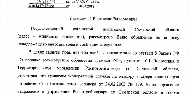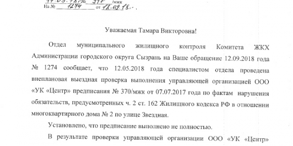 УК " Центр" вновь не выполнила предписание. В Самарскую областную жилищную инспекцию мы тоже обращались в 2017г. Жалоба была отправлена в Тольятти, проверка не была проведена.