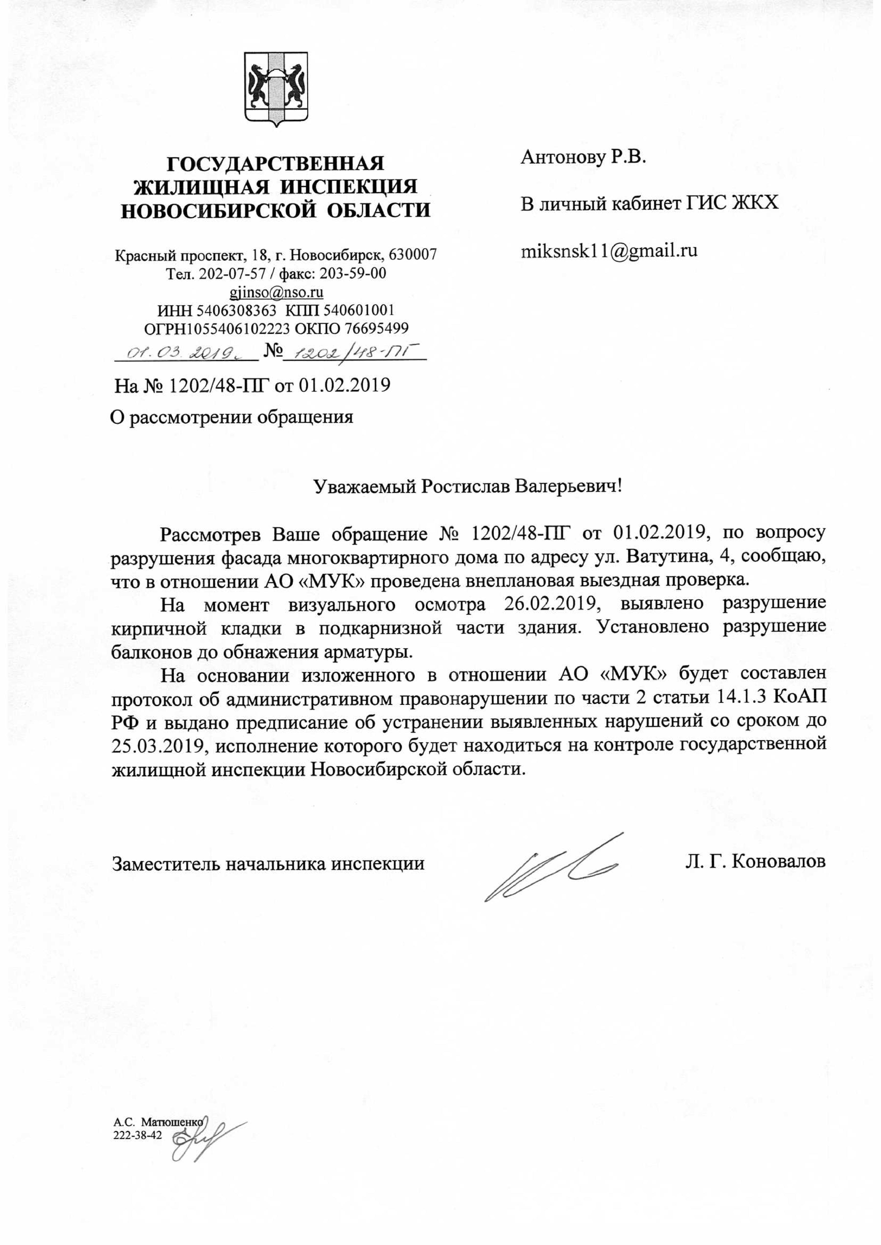 Номер жалобы:48996 Тип жалобы:Иные проблемы ЖКХ Название объекта:Управляющая Компания Город:Новосибирск Адрес:Новосибирск, 6 улица Ватутина Описание жалобы:Рушится фасад. Статус: