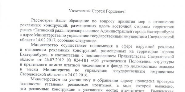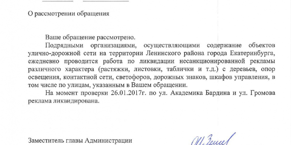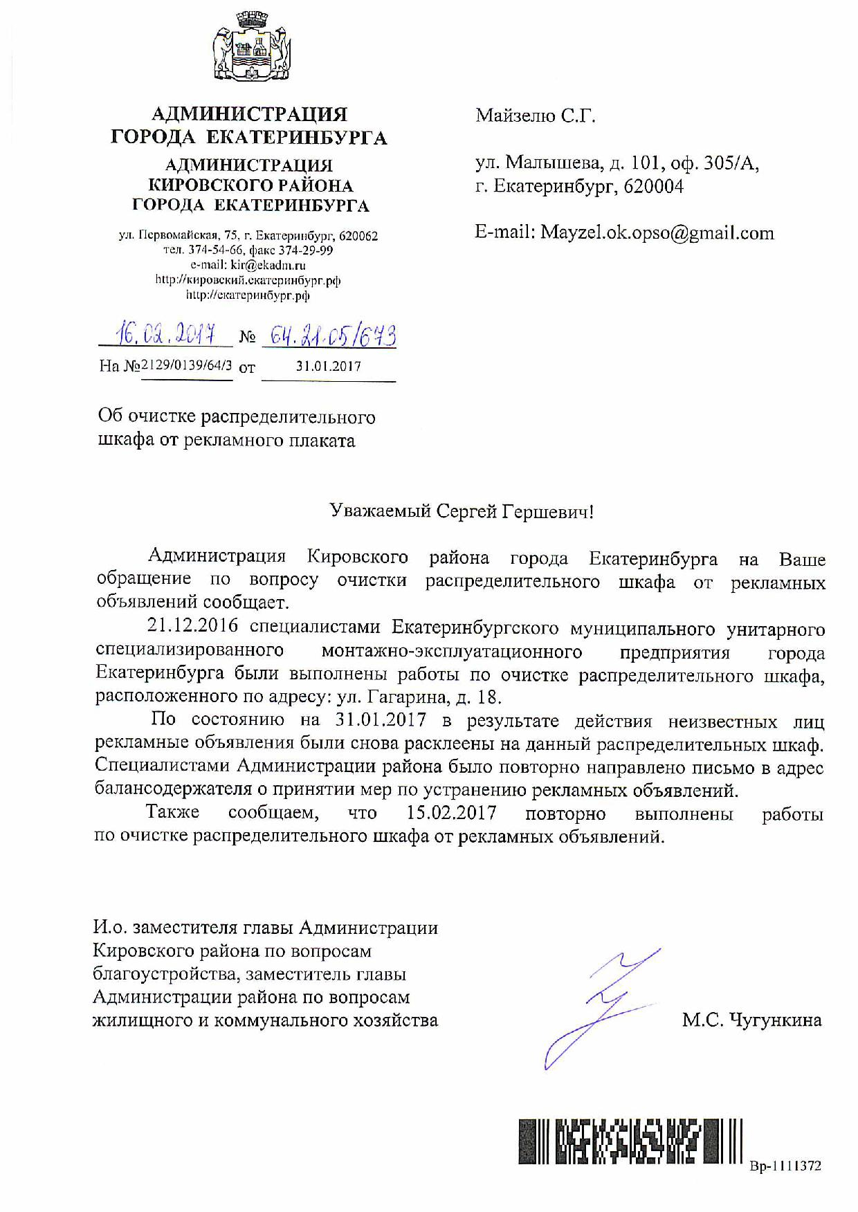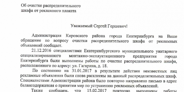 Номер жалобы:14002 Тип жалобы:Ненадлежащее содержание малых архитектурных форм Название объекта:Администрация Екатеринбурга Регион:Свердловская область Город:Екатеринбург Адрес:улица Гагарина, 18 Описание жалобы:На перекрёстке Ленина и Гагарина со стороны Гагарина, 18 на двери распределительного шкафа наклеен рекламный плакат. По данной проблеме я обращался в жалобе 11322. В ответе Администрации сообщается, что работы по очистке двери выполнены. Данная информация не соответствует действительности. Необходимо произвести работы по удалению рекламного плаката с двери распределительного шкафа, расположенного на перекрёстке Ленина и Гагарина со стороны Гагарина, 18. Статус: